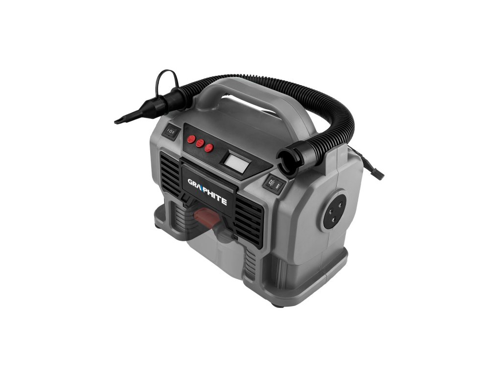 Akumulátorový kompresor Energy+ 18 V bez baterie. Technické údaje: napájecí napětí (baterie Energy+) 18V DC, napájecí napětí (zapalovač cigaret) 12V DC, kompresor a čerpadlo, funkce vypouštění vzduchu, jmenovitý výkon 60 W, pracovní tlak 11 bar, S2: 10 min, hmotnost 1,6 kg. průtok vzduchu 54m3/h Akumulátorový kompresor Energy+ 18 V bez baterie 58GE113 od společnosti GRAPHITE je zařízení, které pracuje s bateriovým systémem Energy+. Doporučené kapacity baterií jsou 2 Ah a 4 Ah. Pracuje s 18V lithium-iontovými bateriemi. Kompresor a čerpadlo v jednom podporují maximální tlak 11 barů/1100 kpa. průtok vzduchu 54m3/h. Přístroj je vybaven displejem, vypouštěním vzduchu, praktickým světlem a nabíjením ze zapalovače cigaret. Jmenovitý výkon je 60 wattů. Sada obsahuje kompresor, hadici na stlačený vzduch a tři koncovky pro nafukování např. míčů nebo matrací. Hmotnost je 1,6 kg.Akumulátorový kompresor značky GRAPHITE se doporučuje pro mnoho univerzálních aplikací.Obrázky jsou pouze ilustrativní.