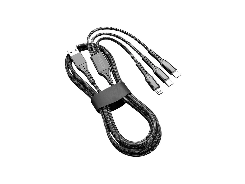 Kabel 3 v 1, kabel pro nabíjení zařízení a synchronizaci dat, možnost nabíjet 3 zařízení najednou, maximální nabíjecí proud: 3,5 A, maximální intenzita nabíjení pro jednu koncovku: Díky nylonovému plášti se kabel nezamotává a rychle neopotřebovává jako u jiných kabelů, certifikát CE. Kabel 3 v 1, 1,2 m GD038 od společnosti NEO TOOLS je kabel určený k nabíjení tří zařízení současně a k synchronizaci dat. Vyznačuje se maximálním nabíjecím proudem 3,5 A a 2 A pro jeden konec. Jeho délka 120 cm zajišťuje pohodlné používání a díky použití nylonového pláště se kabel NEO TOOLS nezamotává a neopotřebovává tak rychle jako jiné kabely. Výrobek má vstup 1x USB-A a výstupy 1x Lightning, 1x USB-C a 1x Micro USB. Splňuje certifikaci CE.Obrázky jsou pouze ilustrativní.
