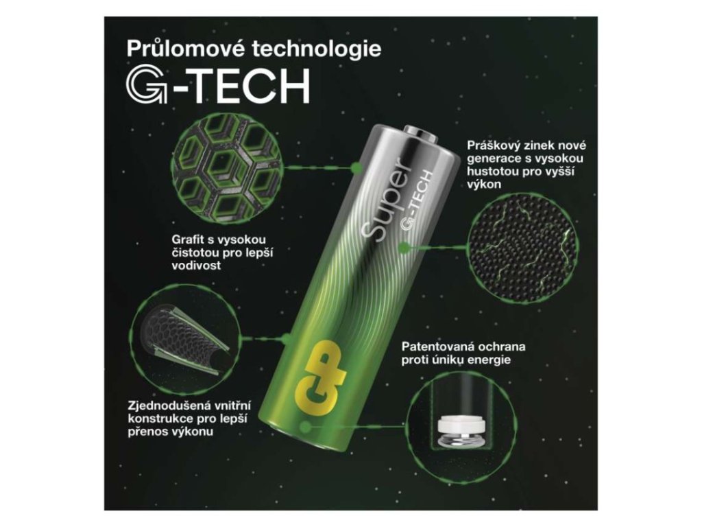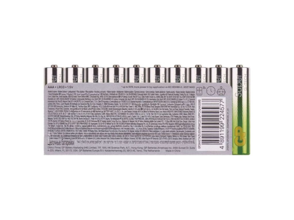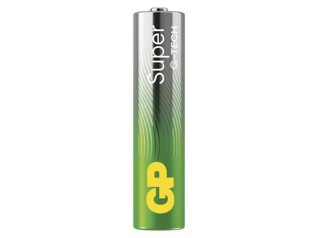 chemické složení: alkalické|hmotnost: 11,5 g|kapacita: neuvádí se|kategorie/řada: Super Alkaline|max. skladovatelnost: 10 let|možnost nabíjení: ne|napětí: 1,5 V|počet nabíjecích cyklů: nenabíjecí|prodejní obal: 20 ks, fólie|provozní teplota: -18 °C až +50 °C|rozměr: 10,5 × 44,5 mm|typ: LR03 (mikrotužka, AAA)|velikost baterie: AAA|značka: GPObrázky jsou pouze ilustrativní.