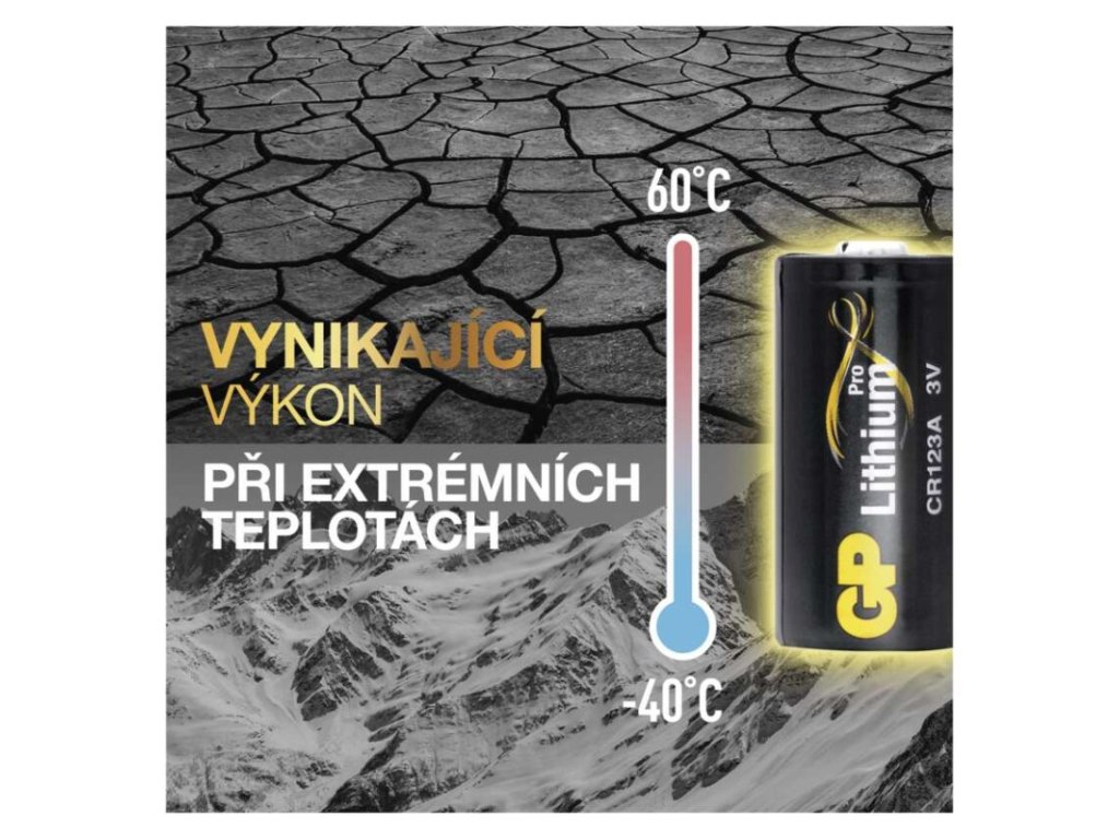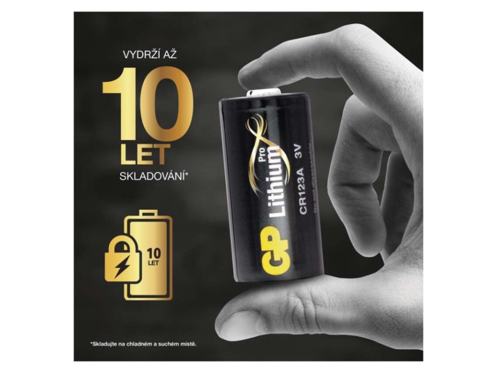 chemické složení: lithiové|hmotnost: 16 g|kapacita: 1 550 mAh|kategorie/řada: Lithium|max. skladovatelnost: 10 let|možnost nabíjení: ne|napětí: 3 V|počet nabíjecích cyklů: nenabíjecí|prodejní obal: 1 ks, blistr|provozní teplota: -40 °C až +60 °C|rozměr: 17,0 × 34,5 mm|typ: CR123A (CR123AP, CR17345)|velikost baterie: neuvádí se|značka: GPObrázky jsou pouze ilustrativní.