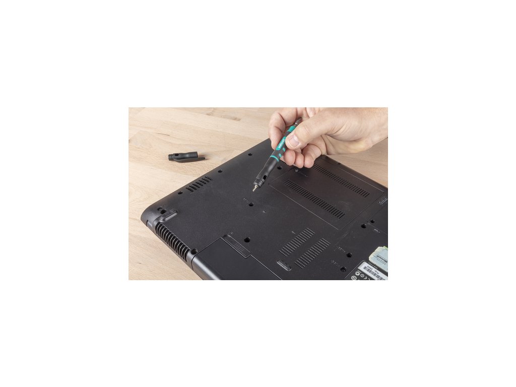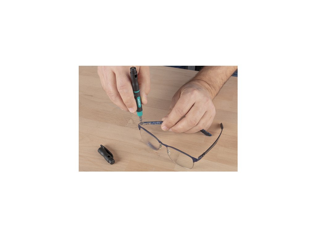 Praktický mikrošroubovák se dvěma dvoustrannými nástavci je ideálním pomocníkem při opravách brýlí, hraček, kalkulaček, domácích spotřebičů a jiných předmětů obsahujících drobné šrouby. Obsahuje čtyři bity pro mikrošrouby Phillips® nebo s drážkou (PH0 + SL 1.5/PH00 + SL 3.0). Výměnu šroubovacího hrotu provedete jednoduchým obrácením nástavce v držáku. Díky kompaktnímu provedení ve tvaru pera můžete mít tohoto chytrého pomocníka kdykoli po ruce v kapse kalhot nebo jej připevnit sponkou. Magnet v čepičce pera napomáhá snazšímu umístění šroubu. Šroubování tak bude hračkou. Vlastnosti šroubovák se čtyřmi vyměnitelnými dvoustrannými nástavci pro velmi malé šrouby 2 vyměnitelné dvoustranné nástavce pro mikrošrouby Phillips® nebo se zářezem (PH0 + SL 1.5/PH00 + SL 3.0) pro rychlou změnu nářadí praktický, kompaktní tvar pera pro jednoduchou manipulaci magnetická čepička pro jednoduché polohování šroubů sponka k připevnění na kapsu košile nebo kalhot Technické údaje Průměr výrobku 15 mm Délka čepele 55 mm Rukojeť 2komponentní držadlo Uchycení nástrčné hlavice šroubováku Šestihranné uchycení 6,35 mm (¼") Délka (hloubka) výrobku 132 mm Upozornění k obsluze Osoby s kardiostimulátorem musí s mikrošroubovákem manipulovat vždy v dostatečné vzdálenosti od srdce! Kontaktní informace výrobce/dovozce: wolfcraft GmbH Wolffstraße 1 56746 Kempenich, Germany Tel: +49 2655 510 info@wolfcraft.com www.wolfcraft.comObrázky jsou pouze ilustrativní.