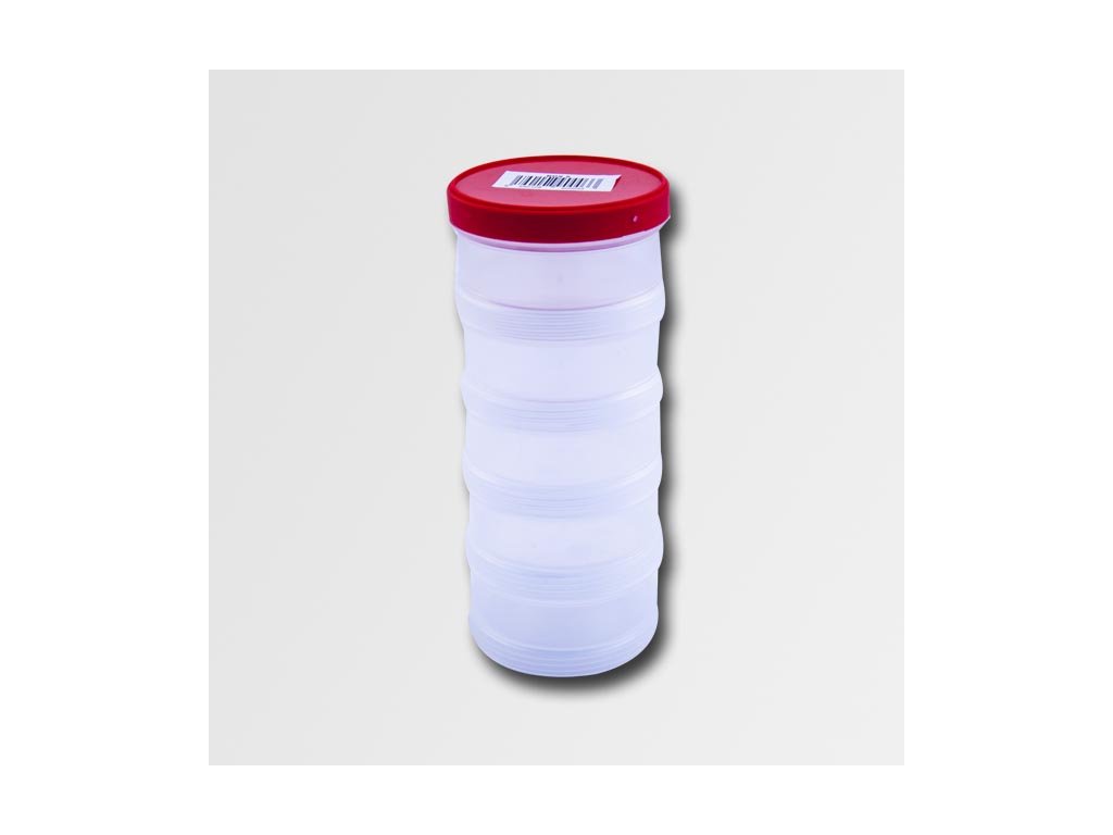 Plastové šroubovací boxy o průměru 9 cm s červemým víčkem.Obrázky jsou pouze ilustrativní.
