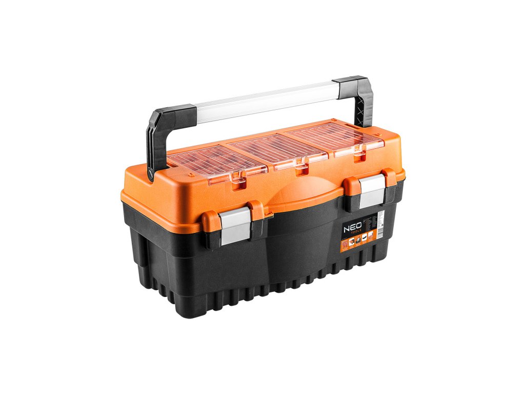 Box na nářadí 21" NEO (ref. 84-105) rozměry 54,7 x 27,1 x 27.8 cm, hliníková rukojeť, hliníkové západky, 2 organizéry, polykarbonátové kryty organizérů, rozkládací přihrádka, prostor pro visací zámek Praktická a masivní skřínka na nářadí TOPEX z odolného plastu s hliníkovým zapínáním. Skřínka je opatřena 2 pořadači pro uskladnění drobných prvků, vnitřním rozkládacím tácem a pohodlnou hliníkovou rukojetí umožňující přenášení. Značka NEO splňuje očekávání profesionálů.Obrázky jsou pouze ilustrativní.