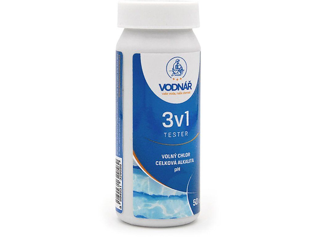 Tester 3 v 1 (50 ks) VODNÁŘ. balení: 50 ks Proužkový tester obsahující 50 proužků na měření volného chloru/bromu, pH a celkové alkality.Obrázky jsou pouze ilustrativní.