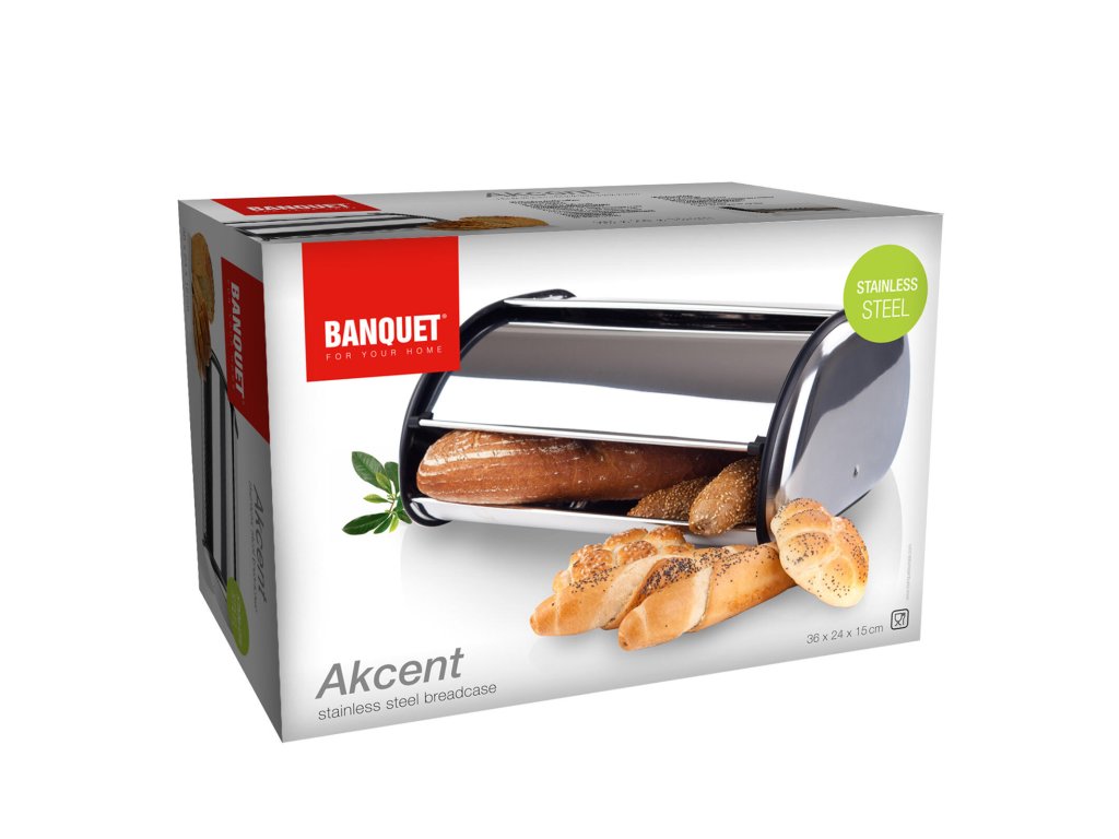 Chlebovka 36 x 24 x 15 cm, AKCENT, nerez. rozměry: 36 x 24 x 15 cm materiál: nerez Nerezový chlebník AKCENT slouží k uchovávání všech druhů pečiva. Povrchová úprava lesk, typ nerezové oceli: 201, síla nerezi 0,30 mm.Obrázky jsou pouze ilustrativní.