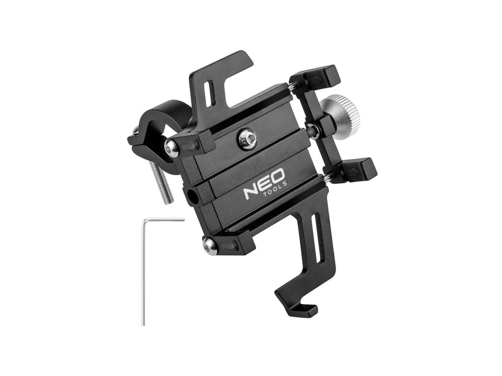 Hliníkový držák telefonu na kolo, nastavitelná šířka pomocí šroubu a knoflíku, rozsah 55-95 mm, silikonové zarážky chrání telefon před poškrábáním, montáž pomocí svorky na trubku o maximálním průměru 35 mm, konstrukce držáku zabraňuje pohybu telefonu během jízdy, možnost změny polohy smartphonu ve svislé nebo vodorovné poloze, lze použít na koloběžce, kole, motorce a kočárku, snadná instalace, montážní klíč je součástí sady. Hliníkový držák telefonu na kolo 91-000 od společnosti NEO, vyrobený z lehkého a odolného hliníku, má nastavitelnou šířku pomocí šroubu s knoflíkem. Rozsah je 55 až 95 mm. Silikonové zarážky chrání telefon před poškrábáním a konstrukce držáku zabraňuje jeho pohybu během jízdy. Položka se snadno instaluje. Montuje se pomocí svorky na trubku o maximálním průměru 35 mm. Součástí balení jsou silikonové gumičky i upevňovací klíč. Držák umožňuje polohování telefonu ve svislé nebo vodorovné poloze. Umožňuje zobrazení navigace během jízdy a je kompatibilní s většinou koloběžek, jízdních kol, motocyklů a dětských kočárků. Značka NEO je doporučena pro uživatele vozidel.Obrázky jsou pouze ilustrativní.