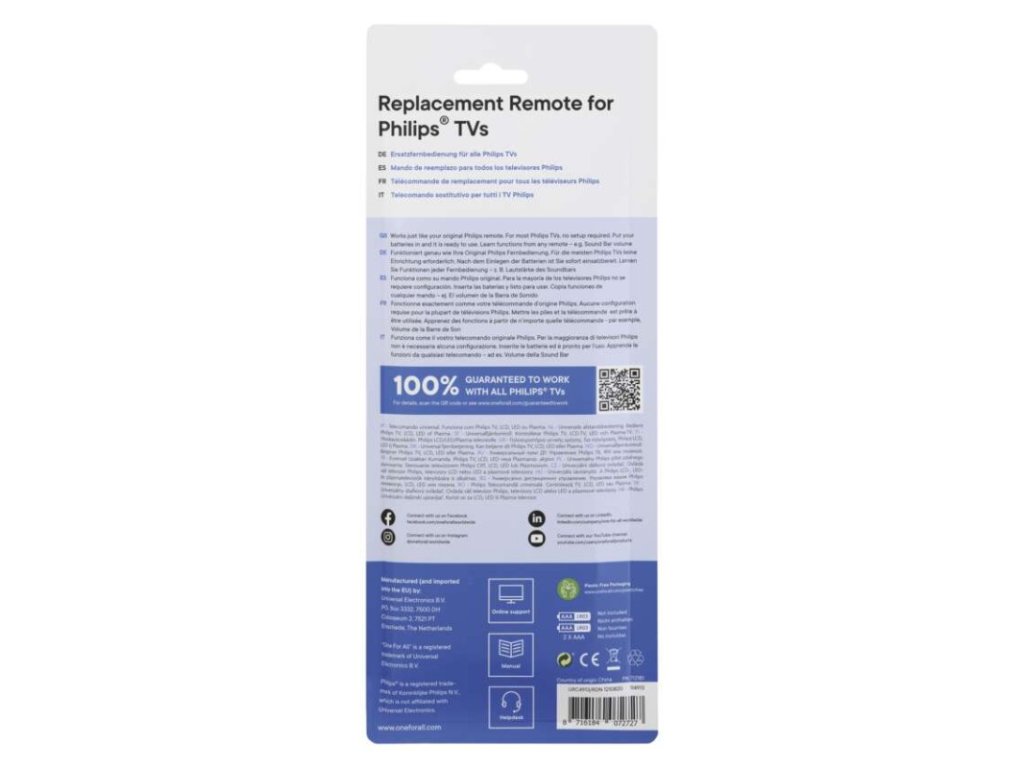 baterie součástí ovladače: ne|dosah: 15 m|funkce combi control: ne|funkce makro: ano|funkce učení: ano|garance podpory ovládání všech značek: neuvádí se|hmotnost: 90 g|modelová řada: speciální TV|napájení: 2× AAA|nastavení a aktualizace přes www.simpleset.com: neuvádí se|paměť kódů po vyjmutí baterií: ano|počet možných ovládaných zařízení: 2|podsvícení kláves: ne|předprogramované kódy: ano|přímá volba zařízení: ne|přímé nastavení kódu: ne|prodejní obal: 1 ks, papírová krabička|rozměr: 22 × 47 × 207 mm|rychlý přístup k oblíbené aplikaci: ano|servisní aktualizace: ano|simple set nastavení: ano – pro audio zařízení|určeno pro: TV Philips a audio zařízení|vyhledání kódu: donastavení kódu pro určitou řadu Philips|zámek hlasitosti: ne|změna nastavení ovládacího tlačítka zařízení: neObrázky jsou pouze ilustrativní.