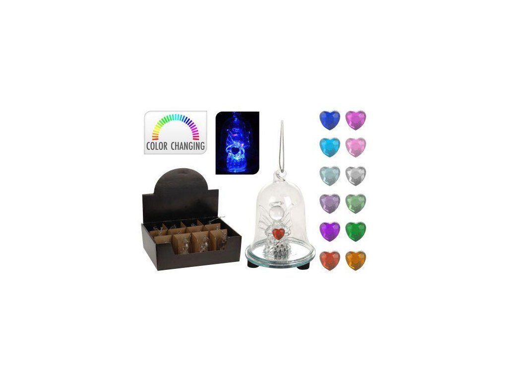Dekorace LED ZVONEK s andělíčkem pr. 6 x 8 cm, sklo mix. průměr: 6 cm výška: 8 cm materiál: sklo mix barev (srdce uvnitř): bílá, žlutá, červená, světle růžová, růžová, světle fialová, fialová, světle modrá, tyrkysová, moodrá, světle zelená, zelená Skleněný dekorační LED ZVONEK s andělíčkem dodá Vaší domácnosti tu správnou slavnostní atmosféru. baterie 3 x AG13, obsahujeObrázky jsou pouze ilustrativní.