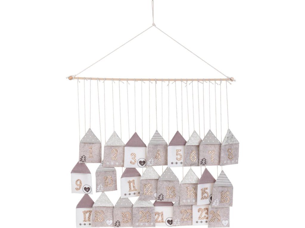 Adventní závěsný kalendář 70 x 60 cm. roměry: 70 x 60 cm materiál: plsť, provázky, dřevěná hrazda barva: krémová, růžová, šedá se zlatými glitrovými dekoracemi motiv domky s čísly 1 - 24 Plstěný adventní kalendář pro drobné dárky zpříjemní předvánoční období.Obrázky jsou pouze ilustrativní.