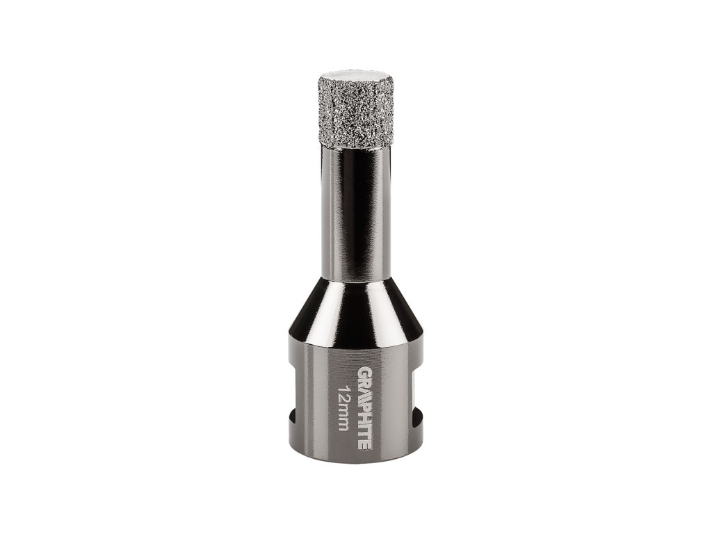 Diamantová fréza, průměr 12 mm, pracovní délka 40 mm, celková délka 60 mm, závit M14, vakuově pájená, pro suchý chod, plnění parafínem, 11000 ot/min. Diamantová pila na otvory GRAPHITE 12 mm (ref. 55H303) se závitem M14 je určena k přesnému řezání kamene, kameniny, dlaždic, skla, asfaltu, cihel a betonu. Díky použití diamantu je řezná síla soustředěna na malou plochu, což eliminuje riziko prasknutí nebo poškození povrchu. Vhodné pro práci v suchu. Pila je vakuově pájená pro zvýšení odolnosti.M14 upnutí, vrtání za sucha, na otáčky 11 000 min-1, vrtání do dlažby, kachlí, betonu a dalších stavebních materiálůObrázky jsou pouze ilustrativní.