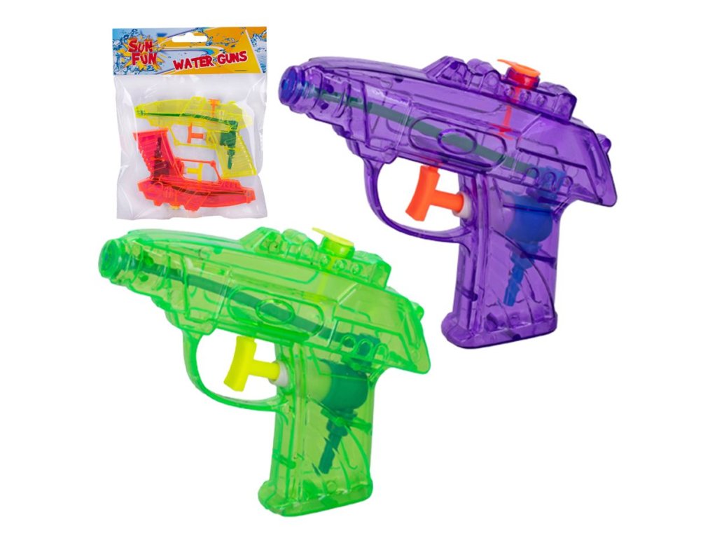 (BAL:1/24/96ks) Vodní pistole stříkací Sun Fun transparentní 2ks plast 12cm. V balení dvě pistole.Vodní pistole jsou skvělou hračkou do horkých dní. Děti se osvěží a užijí si při tom spoustu legrace. Napusť vodu do zásobníku a stříkej vodu na svůj cíl.Barvy: v balení růžová / žlutá nebo zelená / fialová. Rozměry: 12 x 7 x 2cm.Vhodné pro děti od 3 let.Materiál: plast.Rozměr balení: 19 x 14 x 2cm.Balení: sáček se závěsem. Cena za jedeno balení.Obrázky jsou pouze ilustrativní.