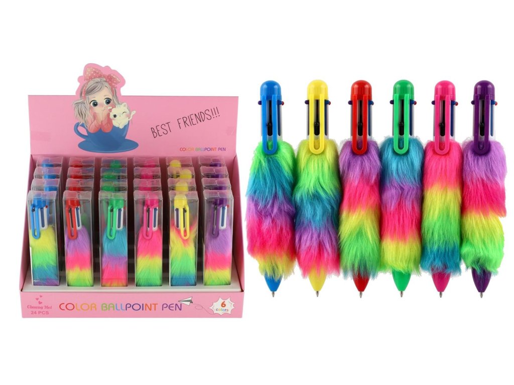 (BAL:1/24/288/4608ks) Propiska plyšová šesti barevná plast 14cm. Šesti barevná propisovačka.Barvy tuhy: modrá, fialová, oranžová, zelená, červená, černá.Design: plyšové provedení těla - 6 druhů.Rozměr: 14x2x1,7 cm. Vhodné pro děti od 3 let. Prodej po 24ks v boxu. Cena za jeden kus. Materiál: plast. Balení: transparentní krabička. Rozměr boxu: 25,5x14,5x14,5cm.Obrázky jsou pouze ilustrativní.