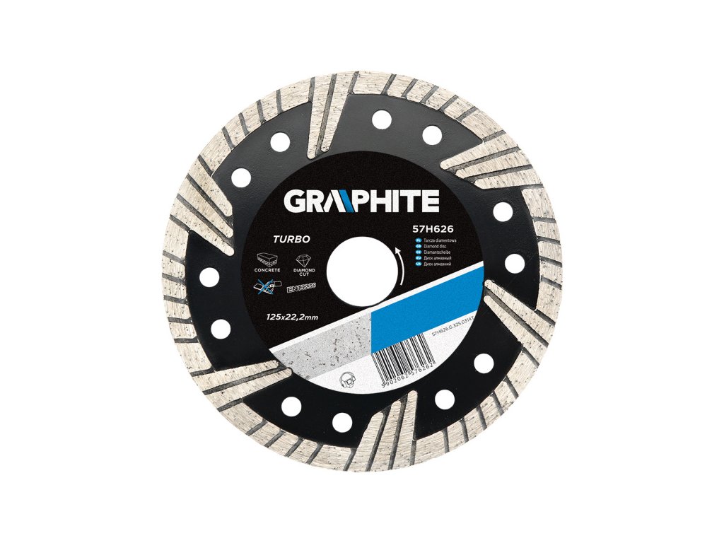 Diamantový kotouč 125 x 22.2 mm, turbo, segment 6 x 2,6 mm Diamantový kotouč turbo GRAPHITE je díky segmentům typu TURBO lisovaným za horka vhodný k vykonávání těžkých stavebních prací. Vysoce odolné diamantové segmenty umožňují účinné řezání prvků z betonu, železobetonu, žuly, mramoru, kamene, cihly, atd.Obrázky jsou pouze ilustrativní.