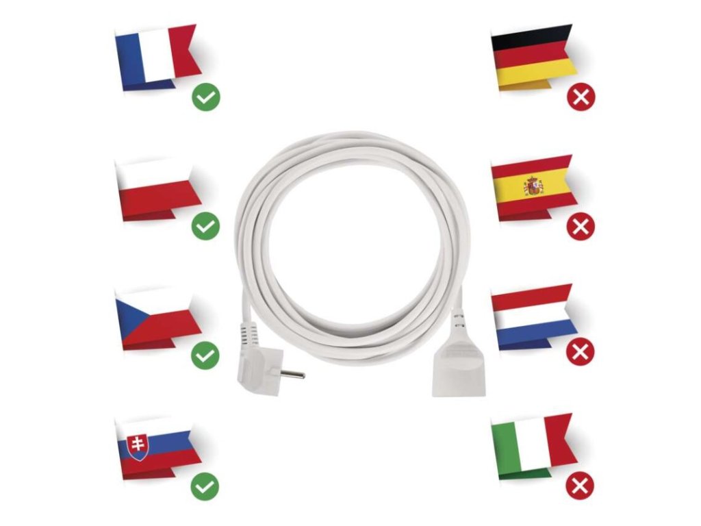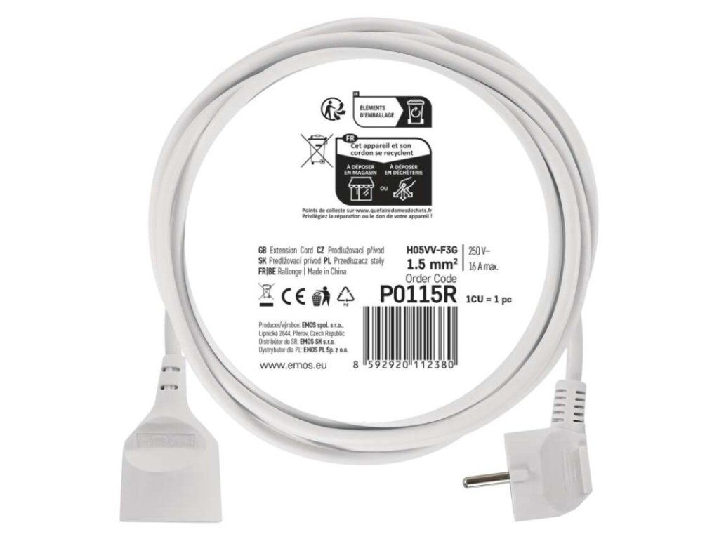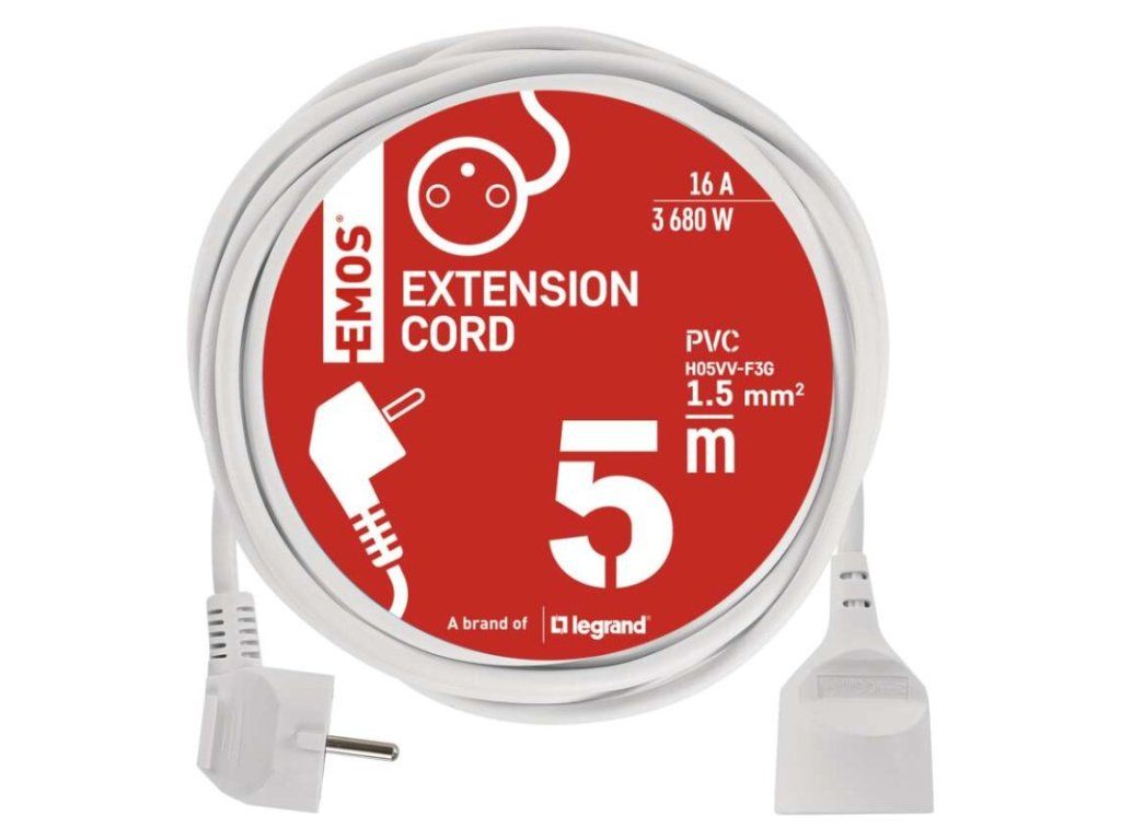 barva: bílá|délka: 5 m|dětské clonky: ano|krytí: IP20|materiál zásuvky a vidlice: plast|max. zátěž: 3 680 W|napětí: 250 V~|počet zásuvek: 1|prodejní obal: 1 ks, závěs|proud: 16 A max.|průřez vodiče: 1,5 mm²|typ izolace: PVC|USB výstup: ne|vodič: H05VV-F3G|vypínač: neObrázky jsou pouze ilustrativní.