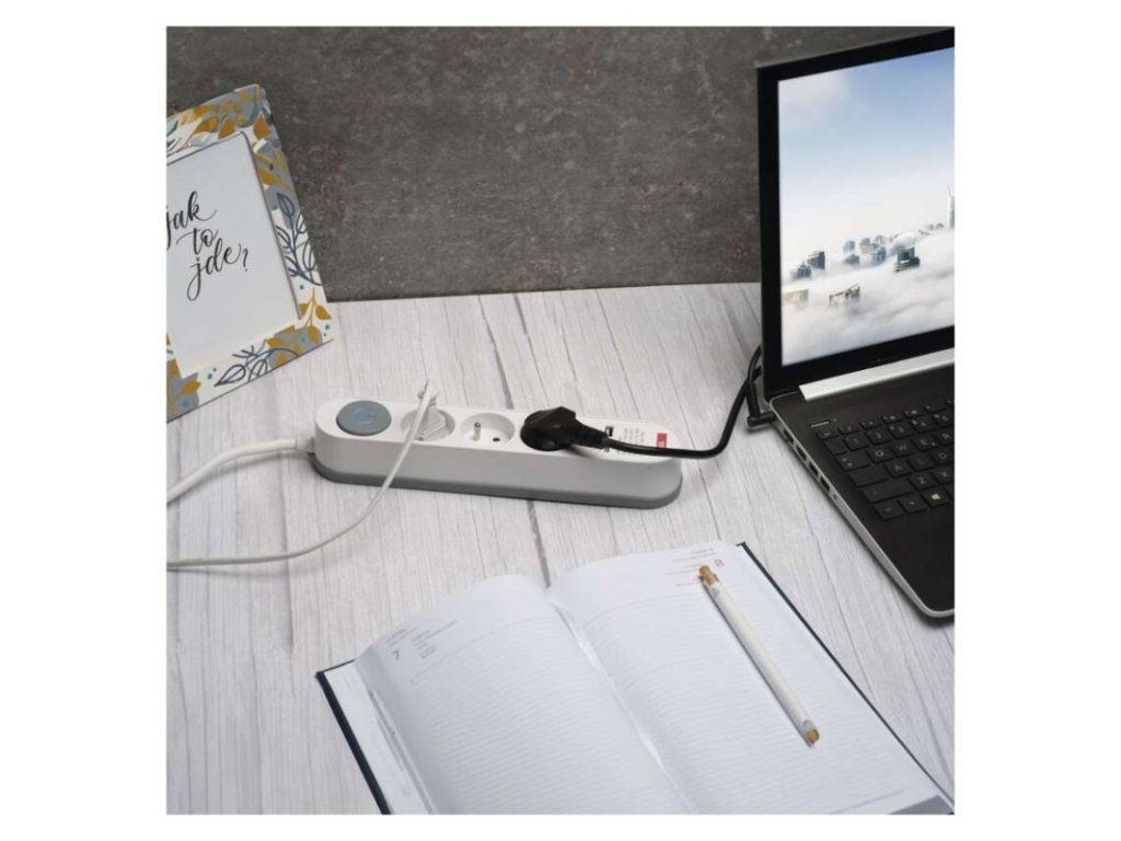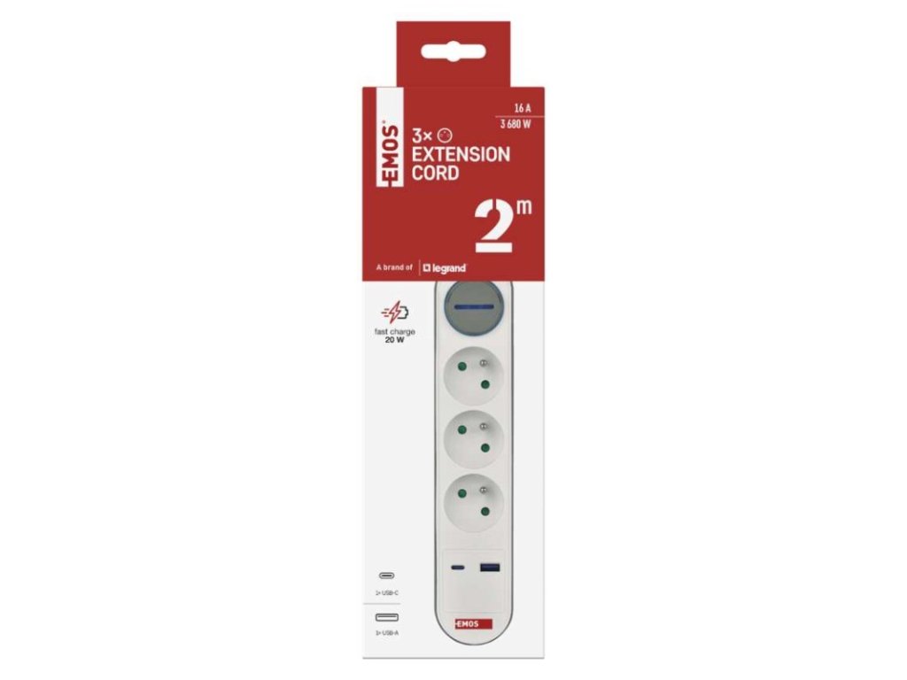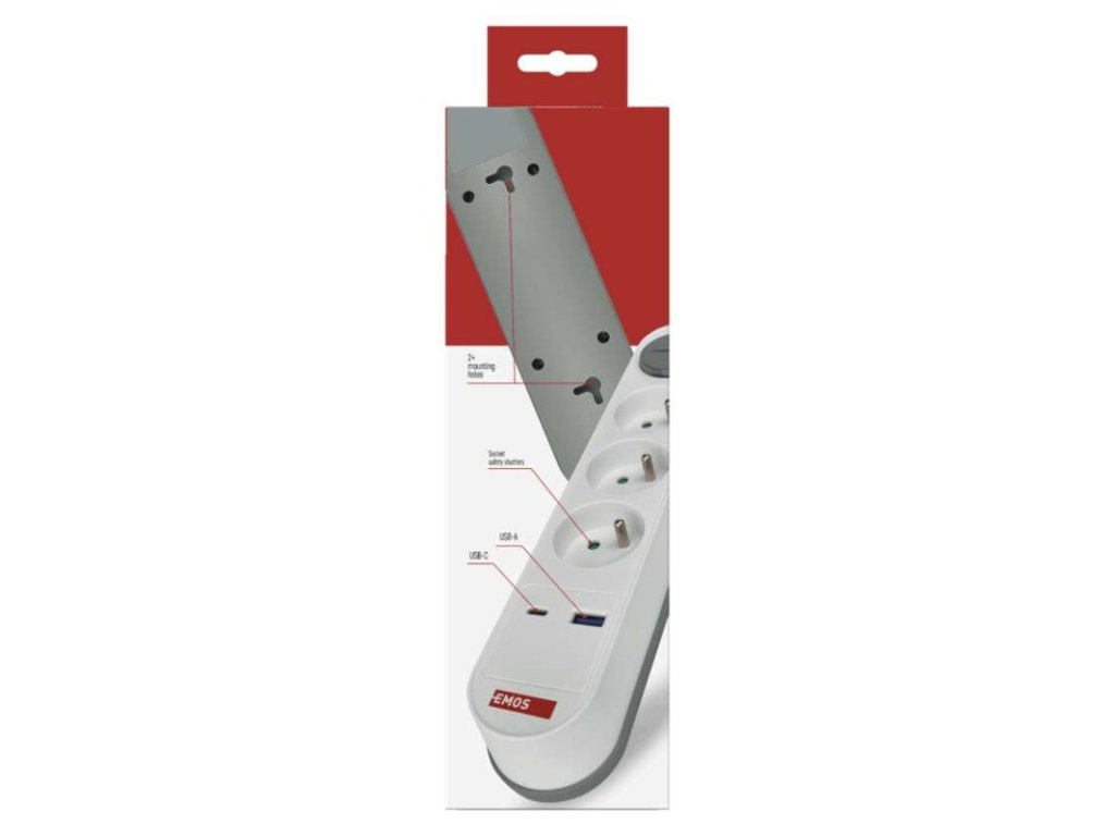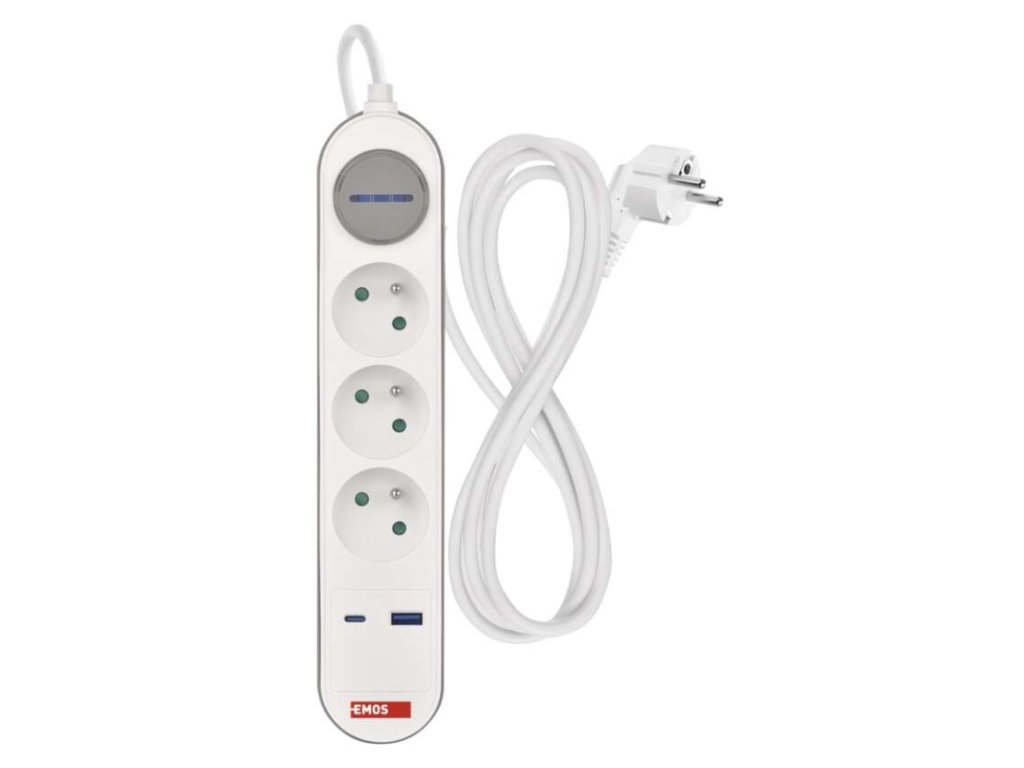 barva: bílá, šedá|další funkce: ne|délka: 2 m|dětské clonky: ano|jazyky aplikace: –|kompatibilita: –|krytí: IP20|materiál zásuvky a vidlice: PC (polykarbonát)|max. zátěž: 3 680 W|napětí: 250 V~|notifikace do mobilní aplikace: ne|ovládání hlasovými asistenty: ne|počet zásuvek: 3× 2P + PE|podporované OS: –|přenosová frekvence: –|prodejní obal: 1 ks, krabice|protokol: –|proud: 16 A max.|průřez vodiče: 1,5 mm²|typ izolace: PVC|USB výstup: 1× USB-A, 1× USB-C, total: 3,1 A – 15,5 W (fast charging)|vodič: H05VV-F3G|vypínač: anoObrázky jsou pouze ilustrativní.
