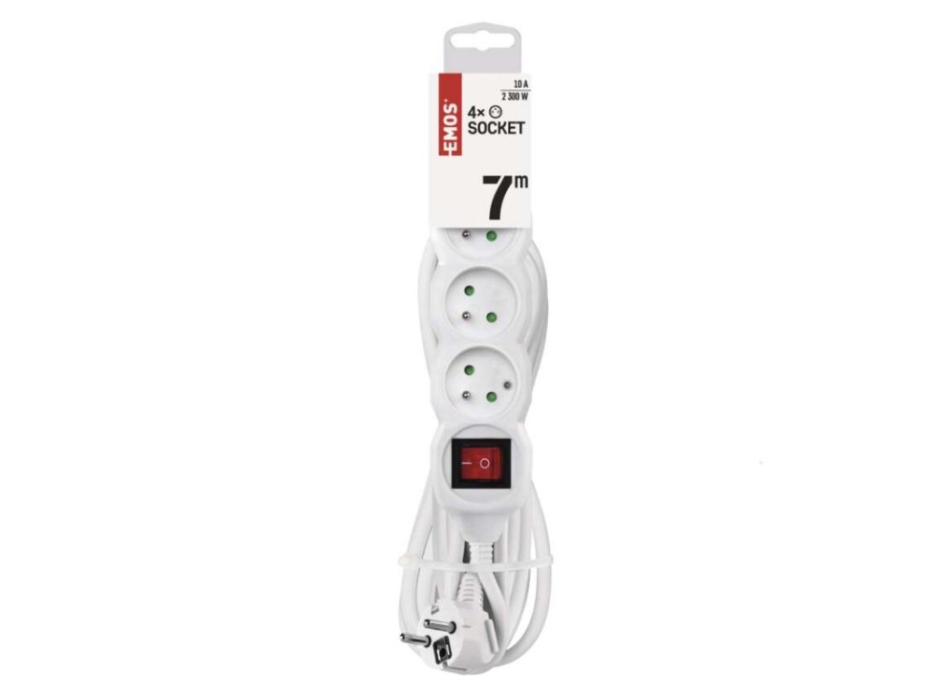 barva: bílá|délka: 7 m|dětské clonky: ano|krytí: IP20|materiál zásuvky a vidlice: plast|max. zátěž: 2 300 W|napětí: 250 V~|počet zásuvek: 4|prodejní obal: 1 ks, závěs|proud: 10 A max.|průřez vodiče: 1,0 mm²|typ izolace: PVC|USB výstup: ne|vodič: H05VV-F3G|vypínač: anoObrázky jsou pouze ilustrativní.