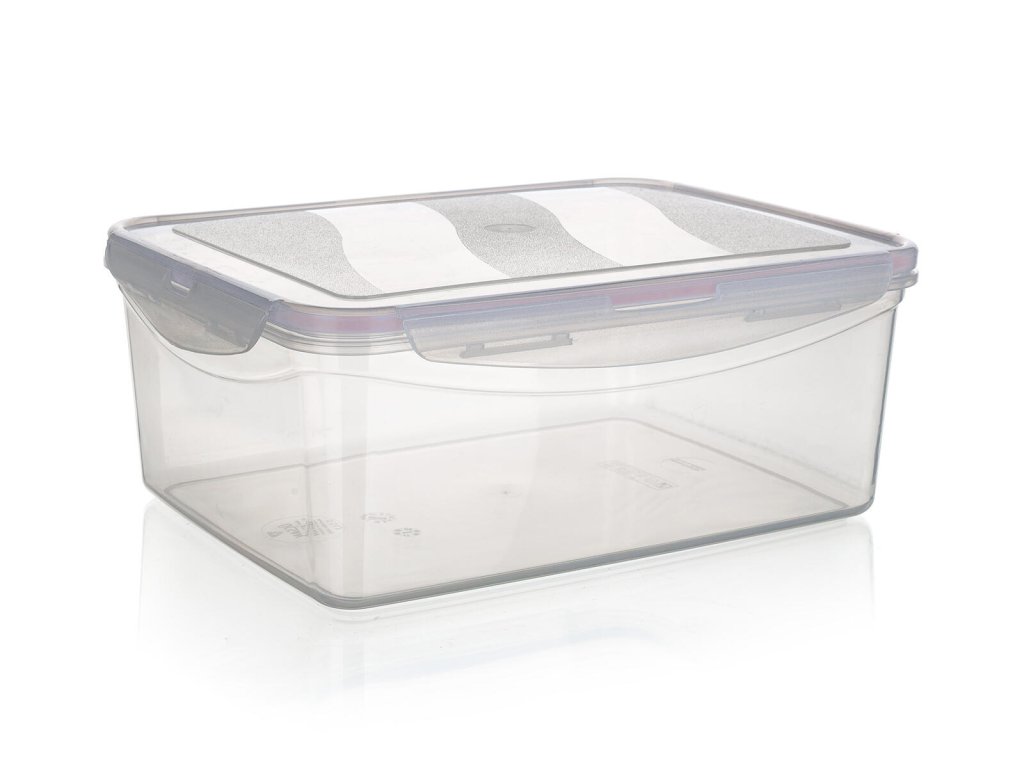 Dóza hermetická LARA, obdélníková, 5,5 l, PH. objem: 5,5 l materiál: plast Plastová dóza na potraviny LARA, s růžovým silikonovým těsněním, zajišťuje vzduchotěsnost dózy. Díky tomu zůstávají potraviny dlouho čerstvé. Použití v mrazničce do - 25 st. C a v mikrovlnné troubě do + 95 st. C.Obrázky jsou pouze ilustrativní.