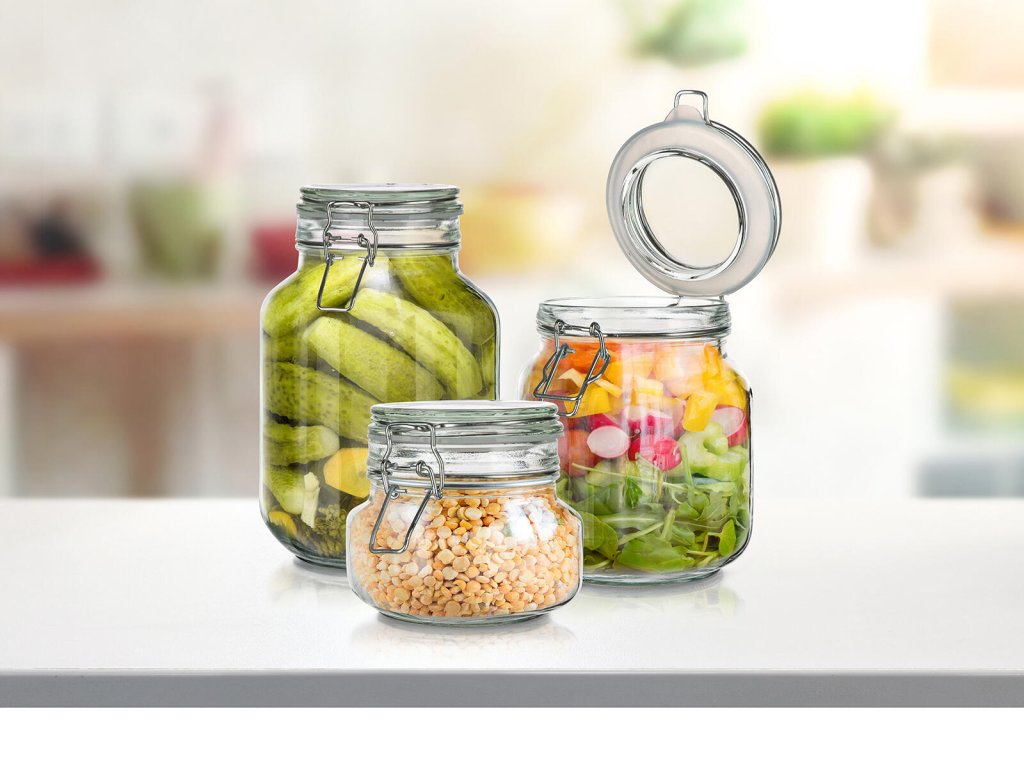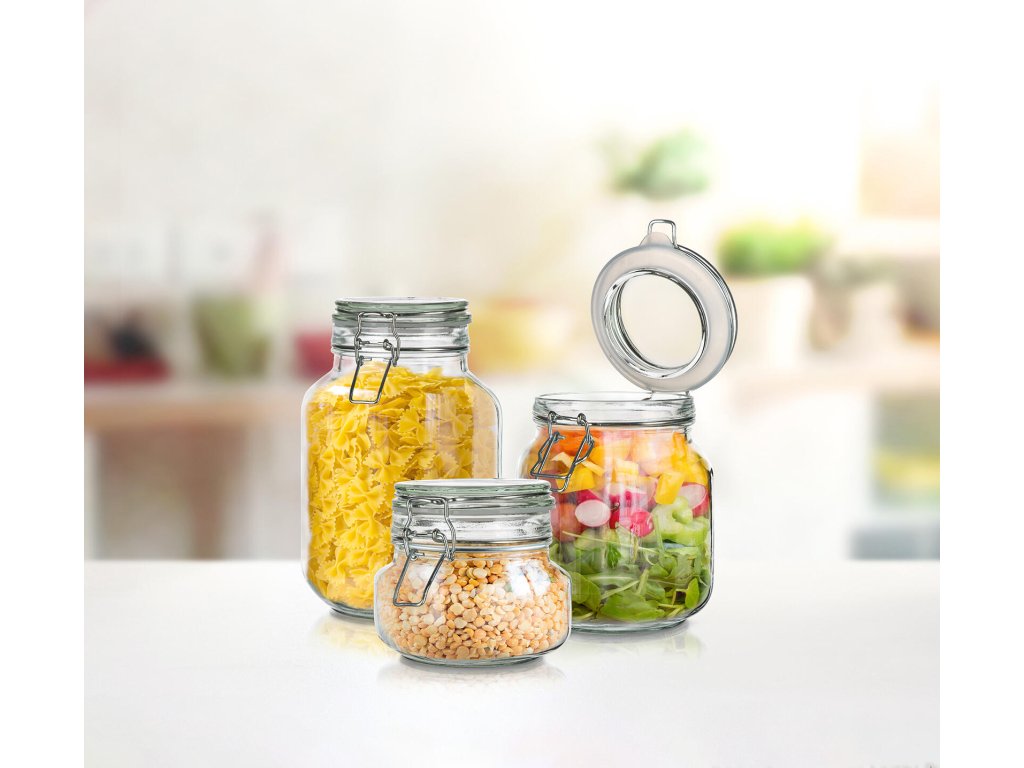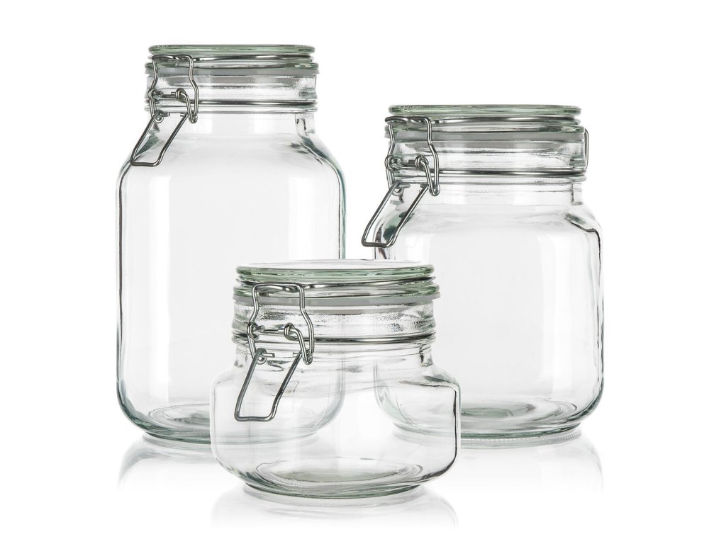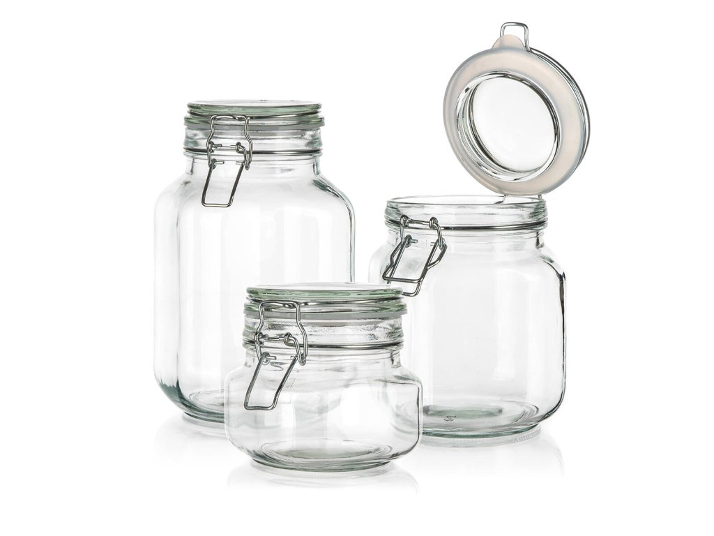 Dóza hermetická EREA, sada 3díl. (0,5 + 1 + 2 l) skleněná, s patentním uzávěrem. sada obsahuje dózy o objemu: - 0,5 l - 1 l - 2 l materiál: sklo Sada skleněných hermetických dóz EREA se skleněným víčkem a kovovým zavíracím patentem, víčko je osazeno silikonovým těsněním, drátěný systém uzávěru není vhodný do myčky (není nerezový). Ideální na uskladnění suchých potravin - těstoviny, houby atd. nebo nakládání.Obrázky jsou pouze ilustrativní.