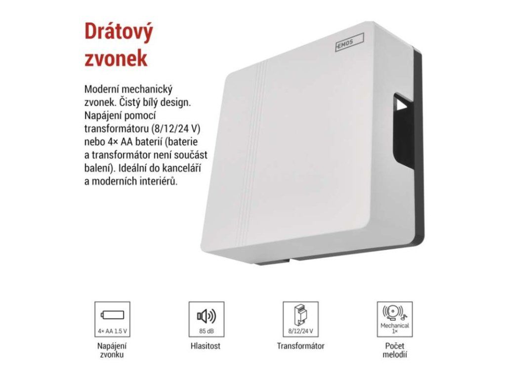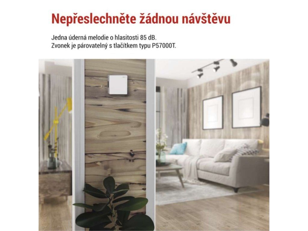 barva: bílá|další funkce: –|dosah tlačítka: drátové spojení|hlasová komunikace: ne|instalační materiál: –|jazyky aplikace: –|kompatibilita: –|maximální hlasitost zvonění: 85 dB|možnost přidat další tlačítko: ne|napájení hlavní jednotky: 4× 1,5 V AA/transformátor (nejsou součástí balení)|napájení tlačítka: drátové spojení|notifikace do mobilní aplikace: ne|optická signalizace na tlačítku: ne|optická signalizace na zvonku: ne|ovládání hlasovými asistenty: ne|počet melodií: 1|počet přijímačů v balení: 1 ks|počet tlačítek v balení: není v balení|podporované OS: –|přenosová frekvence: drátové spojení|přídavné (náhradní) tlačítko: P57000T|prodejní obal: 1 ks, krabička|protokol: –|řada: –|regulace hlasitosti: ne|rozměr tlačítka: –|rozměr zvonku: 118 × 118 × 45 mm|speciální funkce: ne|voděodolné tlačítko: –|způsob párování: není|způsob přenosu: drátový zvonekObrázky jsou pouze ilustrativní.