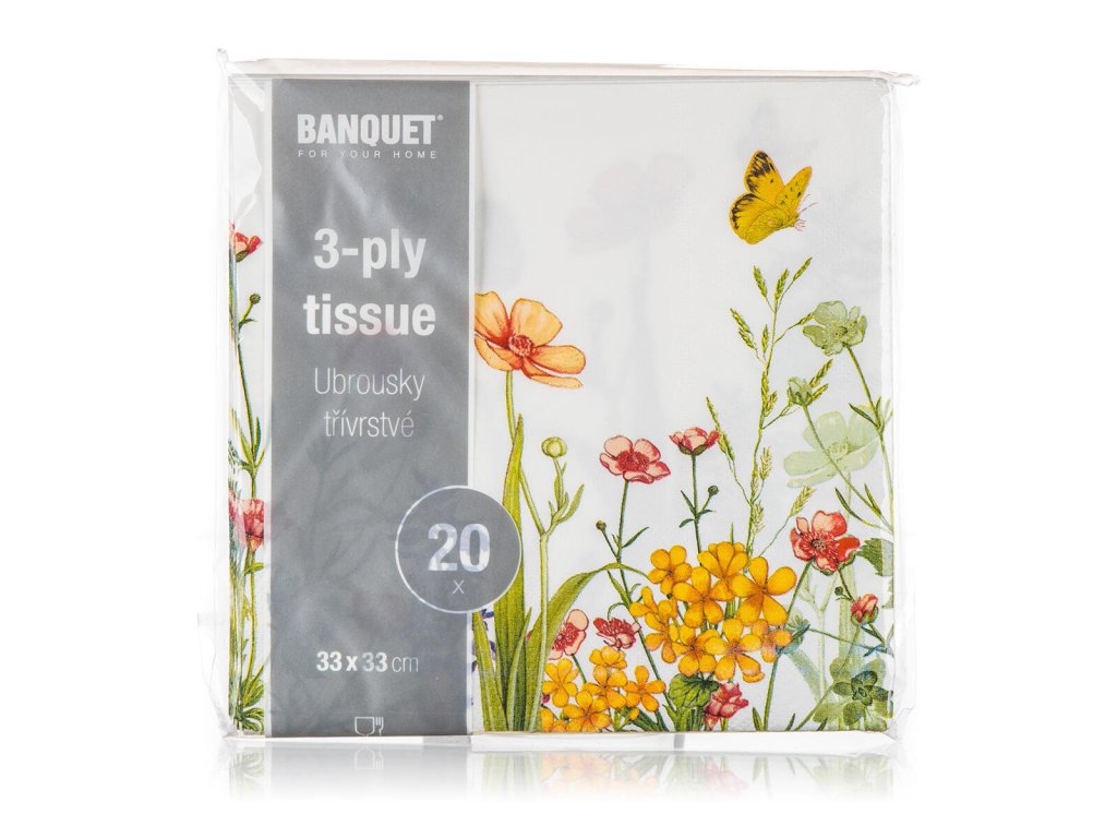 Ubrousky 33 x 33 cm, MEADOW, 3vrstvé (20 ks). rozměry: 33 x 33 cm balení: 20 ks Papírové jídelní ubrousky MEADOW s dekorem rozkvetlé louky, 3vrstvé. Papírové ubrousky jsou nezbytnou součástí nejen při slavnostním stolovaní, ale také při každodenní použití při přípravě svačinek do školy nebo na výlet.Obrázky jsou pouze ilustrativní.