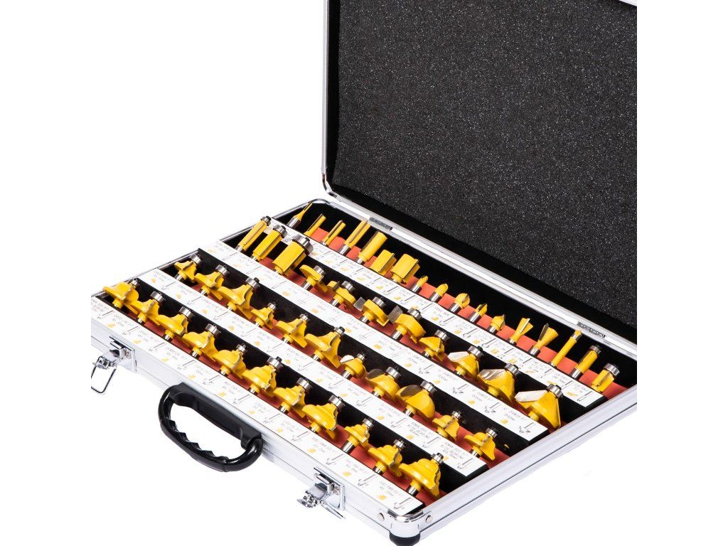 Tvarové frézy pro horní frézu v hliníkovém kufříku.Obrázky jsou pouze ilustrativní.