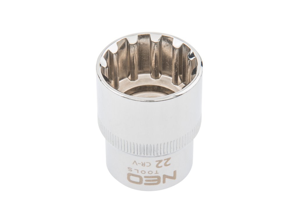 Nástrčná hlavice 1/2", 22 mm, kulový tvar pro metrické a palcové šestihranné šrouby, šestihranná, čtyřhranná, Torx, drážkovaná, CrV ocel, DIN3124, certifikát TÜV M+T, záruka 25 let Nástrčná hlavice Spline 1/2" NEO vyrobený z odolné chrom-vanadiové oceli dle normy DIN 3124. Kulovitý tvar hlavice poskytuje široké možnosti použití, včetně uvolňování šroubů Torx, Spline, dvanáctihranných, metrických, v palcích a čtyřhranných. Kvalitu nářadí potvrzuje certifikát TÜV a záruka výrobce na 25 let. Značka NEO splňuje očekávání profesionálů.Obrázky jsou pouze ilustrativní.