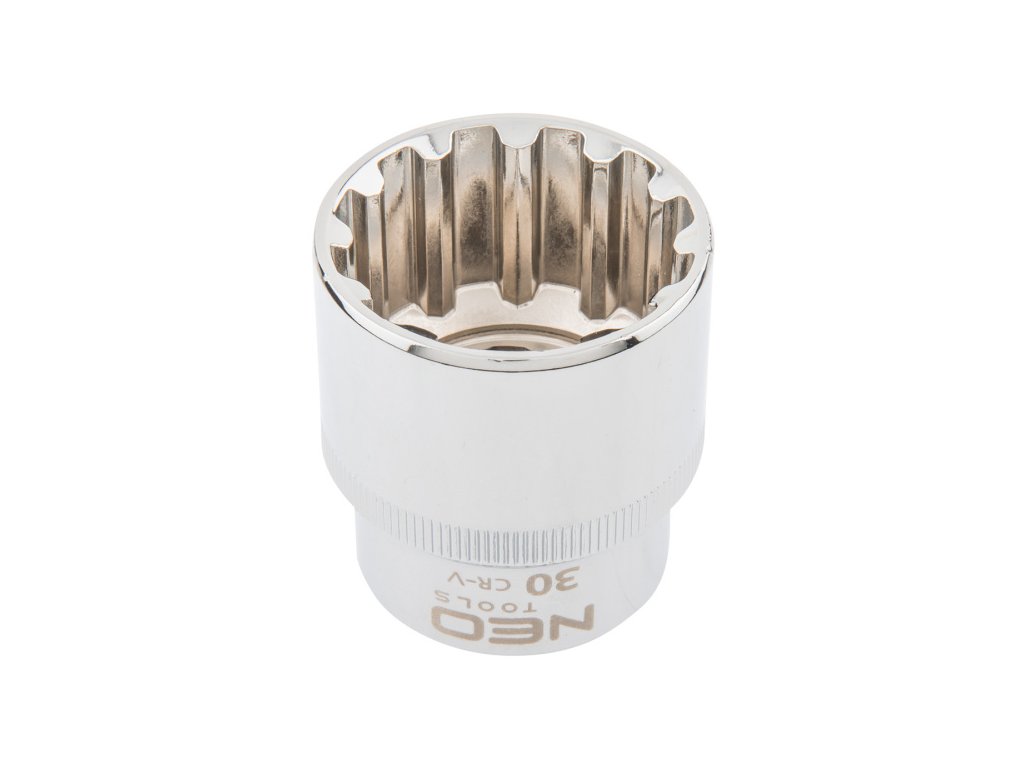 Drážkovaná 1/2" nástrčka, 30 mm, kulový tvar pro metrické a palcové šestihranné šrouby, šestihran, čtyřhran, Torx, drážkování, CrV ocel, DIN3124, certifikát TÜV M+T, záruka 25 let Nástrčná hlavice Spline 1/2" NEO vyrobený z odolné chrom-vanadiové oceli dle normy DIN 3124. Kulovitý tvar hlavice poskytuje široké možnosti použití, včetně uvolňování šroubů Torx, Spline, dvanáctihranných, metrických, v palcích a čtyřhranných. Kvalitu nářadí potvrzuje certifikát TÜV a záruka výrobce na 25 let. Značka NEO splňuje očekávání profesionálů.Obrázky jsou pouze ilustrativní.