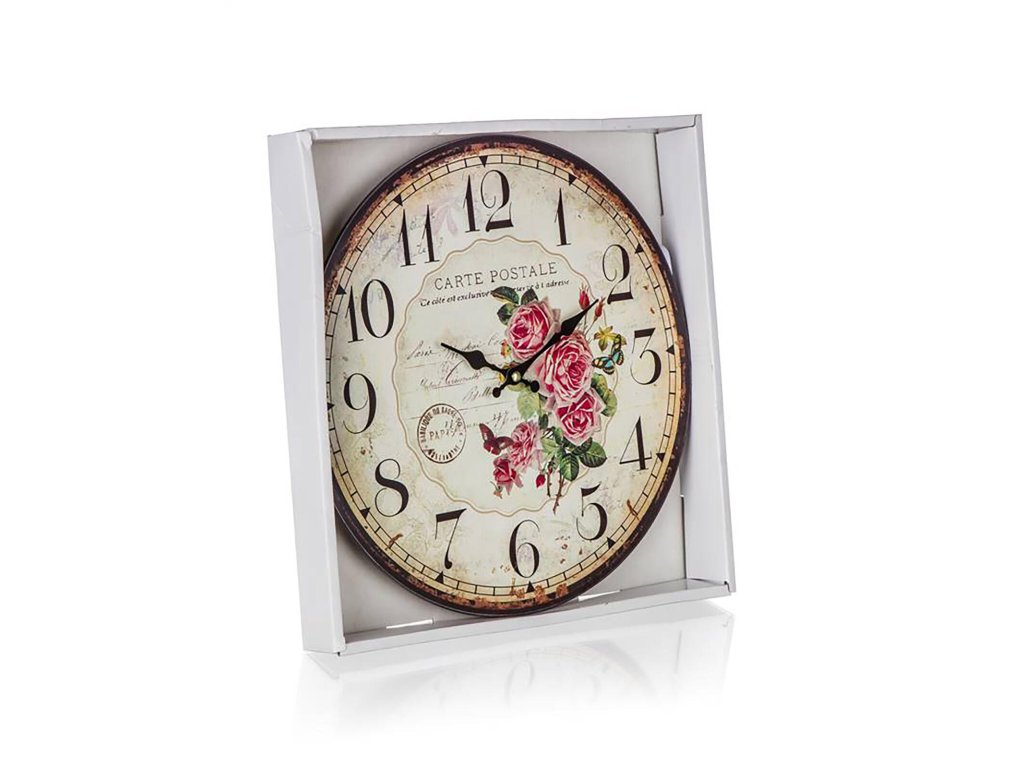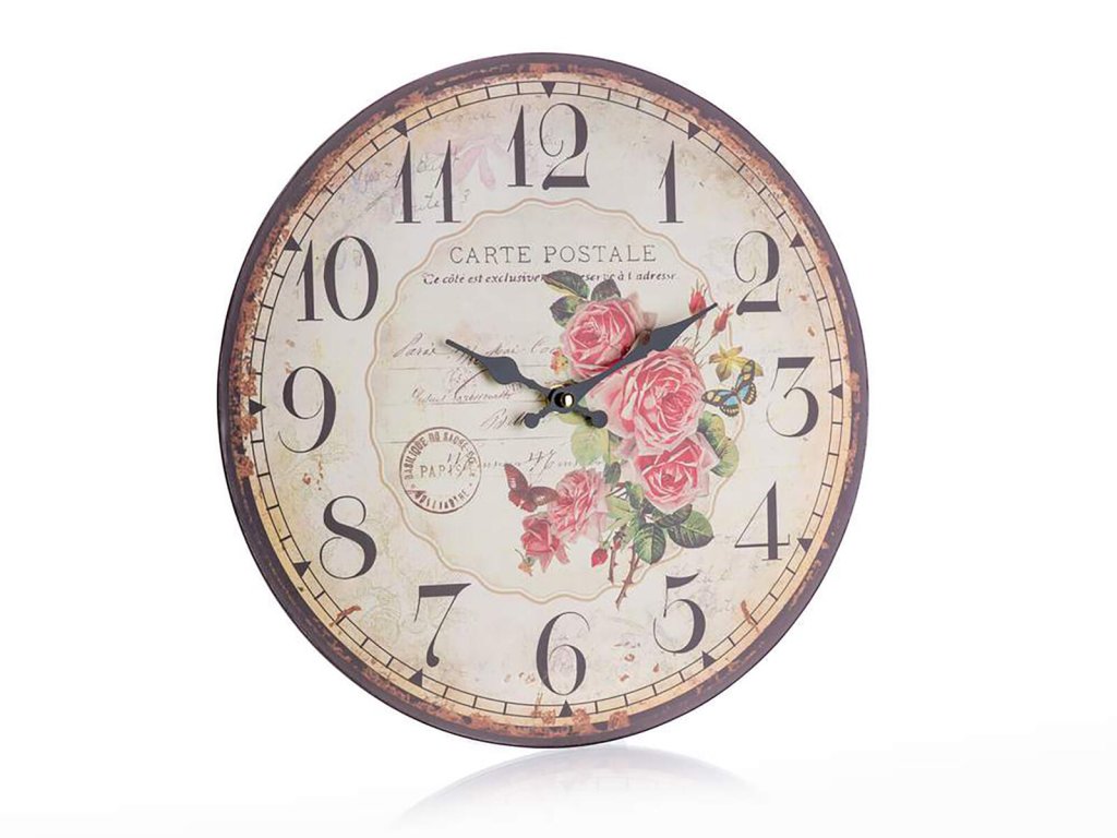 Hodiny nástěnné pr. 34 cm, CARTE POSTALE. průměr: 34 cm Nástěnné kulaté hodiny CARTE POSTALE, s celoplošným dekorem . Hodinový strojek je napájen jedním kusem baterie AA (není součastí balení). Produkt je ideální dekorací do vašeho bytu nebo stylové kuchyně.Obrázky jsou pouze ilustrativní.