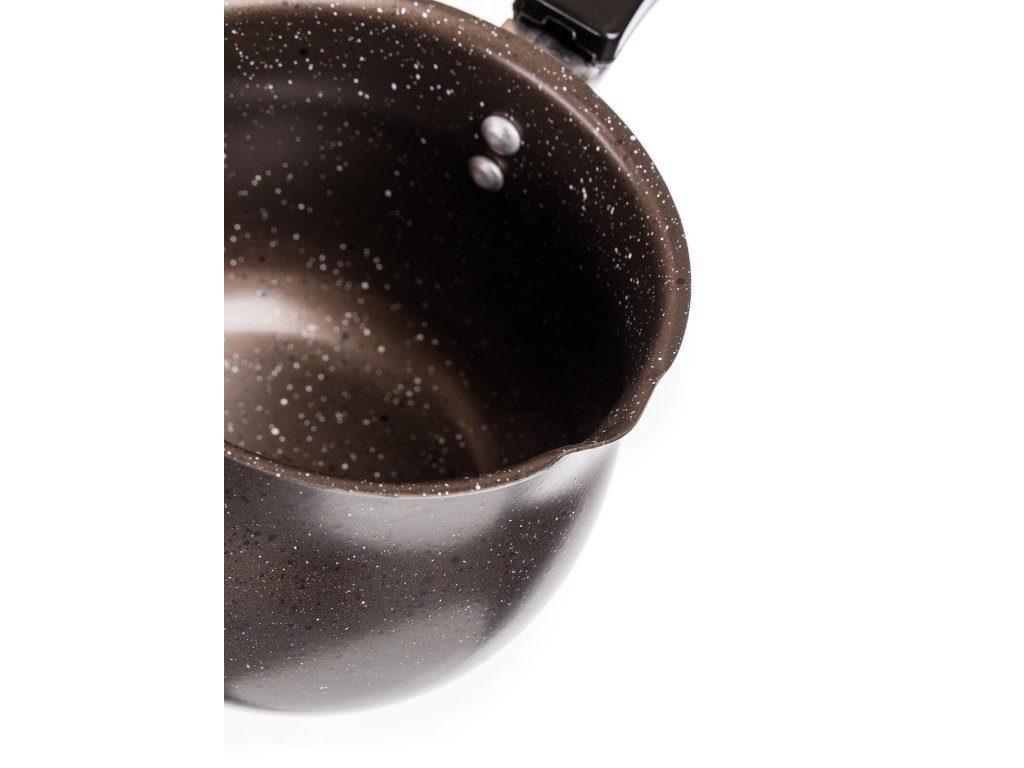 Džezva 0,38 l, nepřilnavý povrch, GRANITE Brown. objem: 0,38 l Džezva GRANITE Brown slouží pro přípravu pravé arabské nebo turecké kávy. Díky džezvě vyrobíte kávu neopakovatelné chuti a vůně. Držadlo je vyrobené z plastu a tělo z uhlíkové oceli s nepřilnavým povrchem. Džezva je určena pro rychlou přípravu nápojů, tenké stěny přenáší rychle teplo.Obrázky jsou pouze ilustrativní.