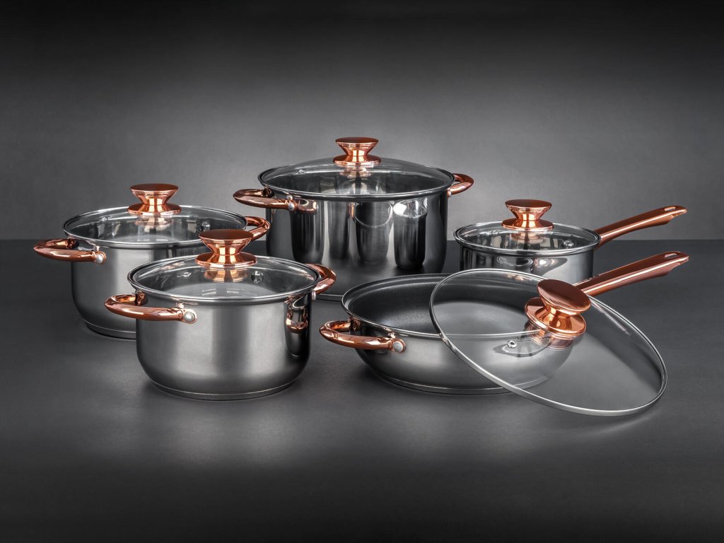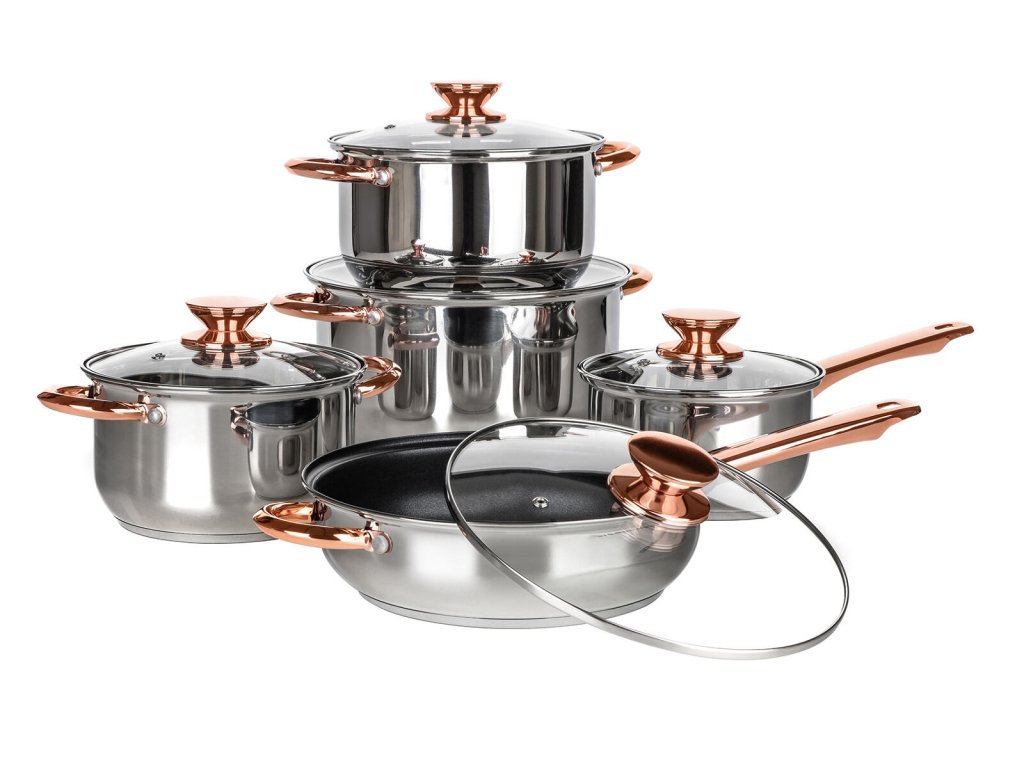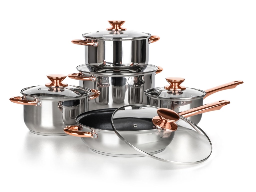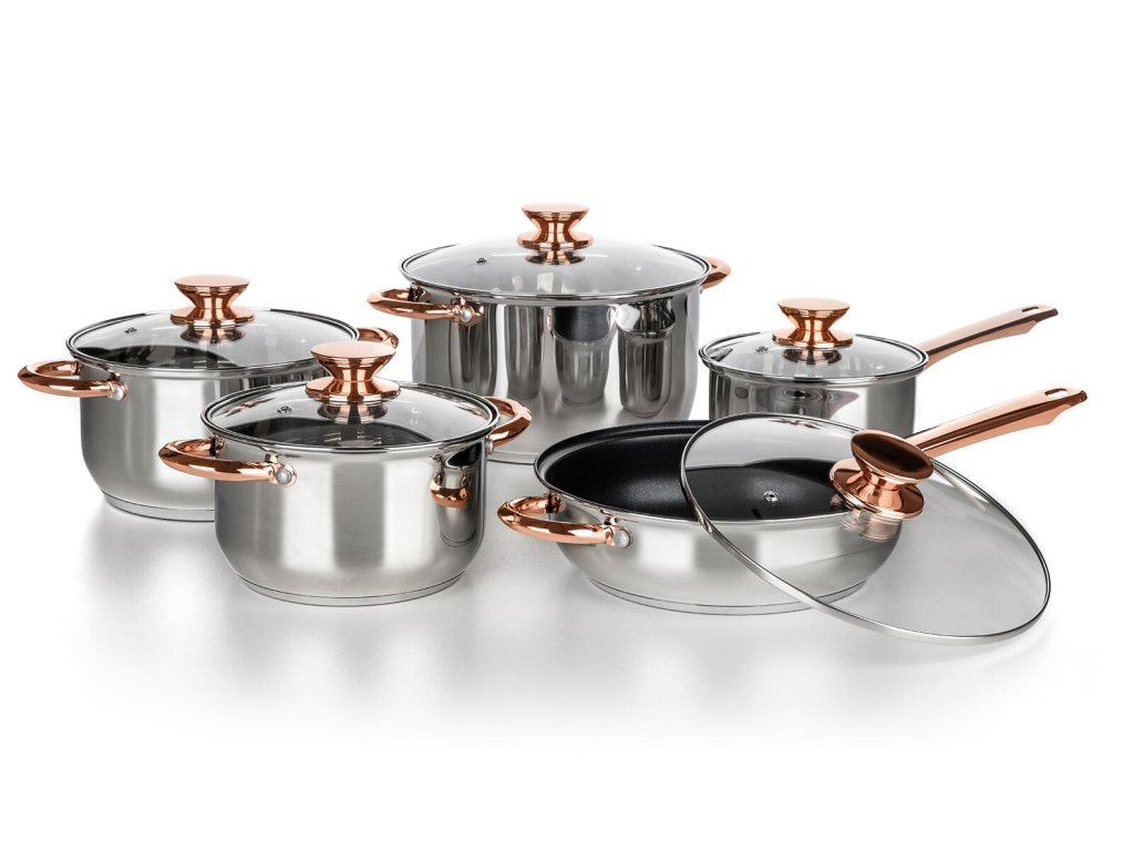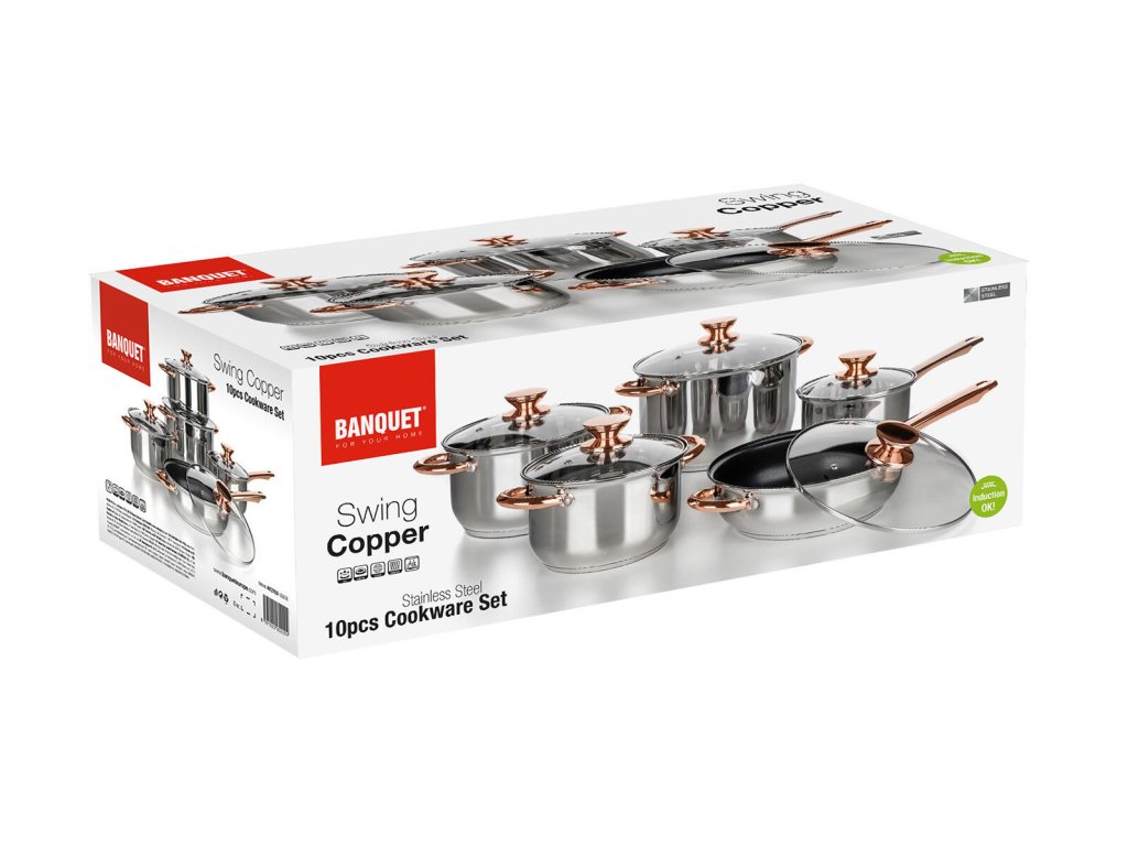 Sada nádobí 10díl., nerez / měď, SWING Copper. Sada nerezového nádobí SWING Cooper 10 ks obsahuje: - rendlík 16 x 9 cm s poklicí - hrnec 18 x 10,5 cm s poklicí - hrnec 20 x 11,5 cm s poklicí - hrnec 24 x 13,5 cm s poklicí - pánev s nepřilnavým povrchem 24 x 6,5 cm s poklicí Nádobí lze používat na všechny typy sporáků. tloušťka dna: 0,38 mm materiál: nerez / 0,5 mm hliník / 1 mm železo / 0,5 mm hliník / 0,38 mm indukční protektor Poklice jsou vyrobeny z odolného skla a mají otvor na páru pro dokonalou kontrolu nad vařením. Povrchová úprava nerezu lesk (uvnitř i vně). Knoby a držadla jsou s barevnou úpravou v měděné barvě. Nádobí se snadno udržuje, lze mýt v myčce. Držadla jsou k hrncům našroubovaná.Obrázky jsou pouze ilustrativní.