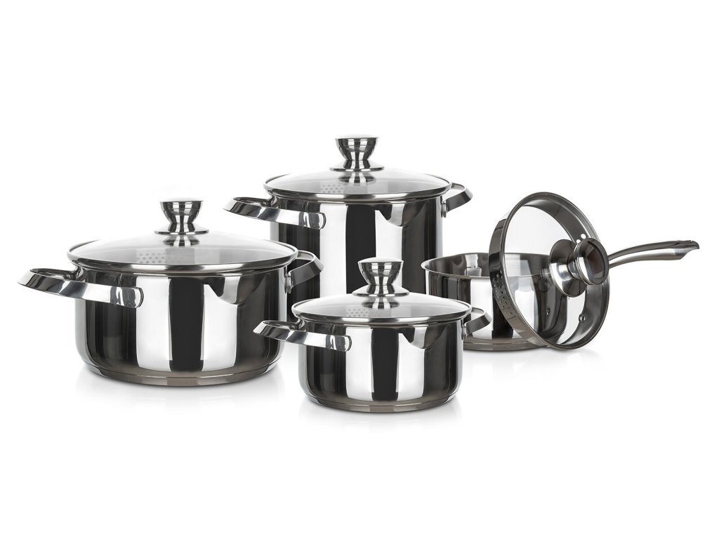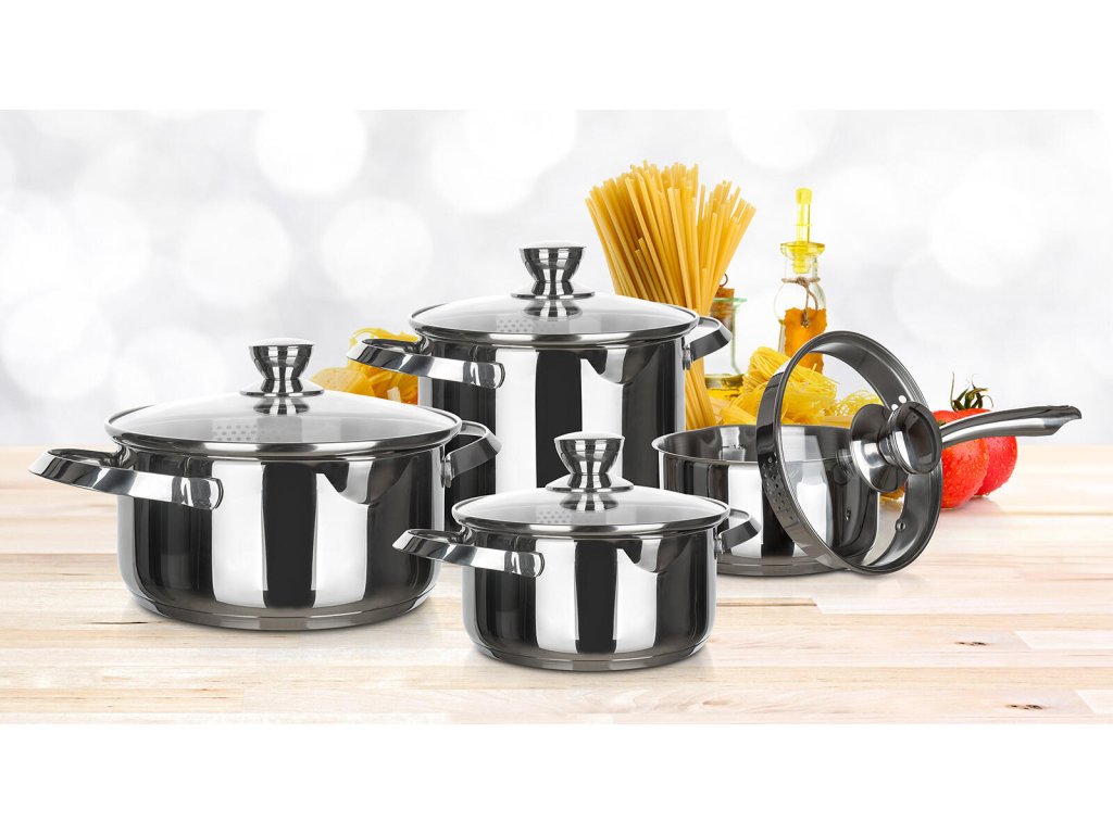 Sada nádobí 8díl., nerez, EMBASSY. sada obsashuje: - rendlík 16 x 8cm, 1,6 l, se skleněnou poklicí - hrnec 18 x 9cm, 2,3 l, se skleněnou poklicí - hrnec 24 x 12,5cm, 5,4 l, se skleněnou poklicí - hrnec 22 x 17 cm, 6,4 l, se skleněnou poklicí Hrnce s praktickou výlevkou a skleněnou poklicí s otvory pro snadné slévání. Vnější i vnitřní povrchová úprava v lesku, uvnitř hrnců je měrka. Nádobí lze používat na všechny typy varných desek včetně indukce. Nerezová sada hrnců EMBASSY - to je vynikající poměr cena / kvalita, široká možnost použití, moderní design.Obrázky jsou pouze ilustrativní.
