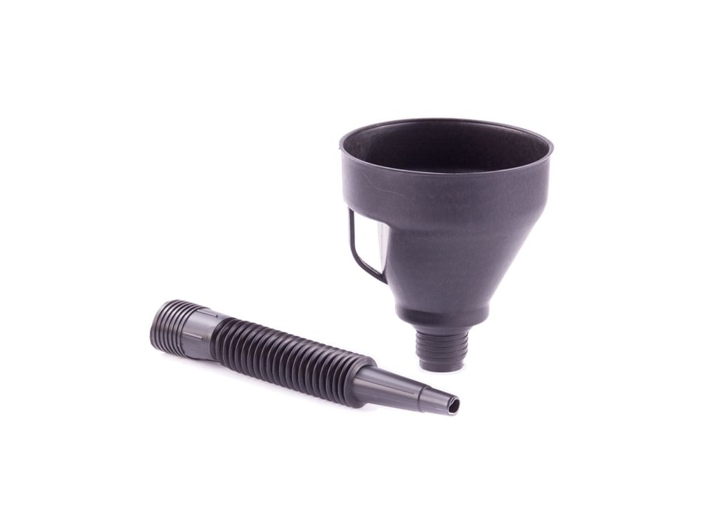 Černý plastový dvoudílný trychtýř s flexibilní hubicí se zúženým vyústěním.