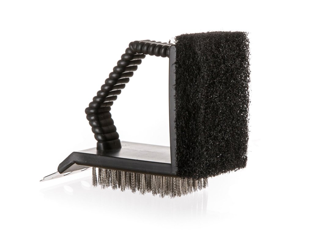 Kartáč na čištění grilu 3 v 1, PH. materiál: plast Plastový čisticí kartáč 3 v 1 je určený na údržbu a čistění grilu a grilovací mřížky. Kartáč je praktický pomocník při úklidu grilu po grilování. Obsahuje škrabku pro odstranění hrubých nečistot z grilovací desky, kovový kartáč na očištění hrubých nečistot z grilovací mřížky a houbovitou stěrku na dočištění urdžovaných ploch.Obrázky jsou pouze ilustrativní.
