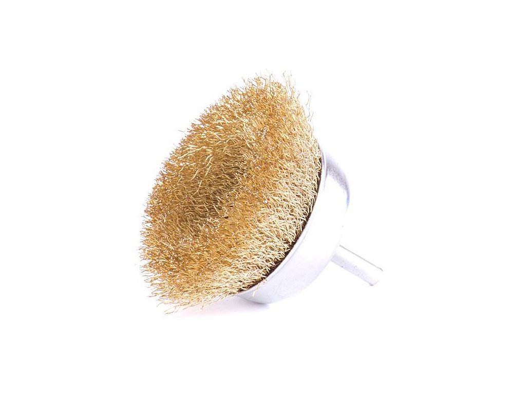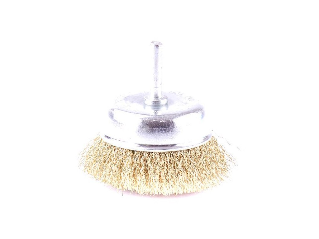 Vlnitý hrnkový kartáč se stopkou pro použití do vrtačky.