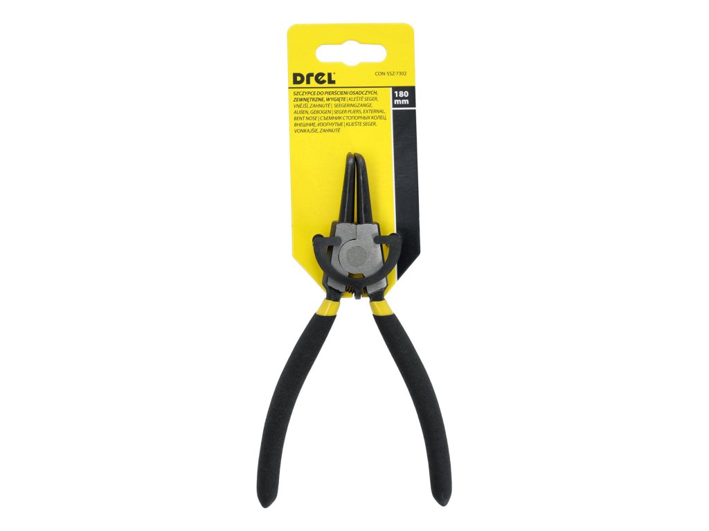Kleště seger vnější zahnuté 180 mm DREL. délka: 180 mm Kleště na vnější pojistné kroužky v zahnutém provedení k montáži a demontáži. Kleště se používají na upevňování ložisek na hřídelích nebo otvorech.Obrázky jsou pouze ilustrativní.
