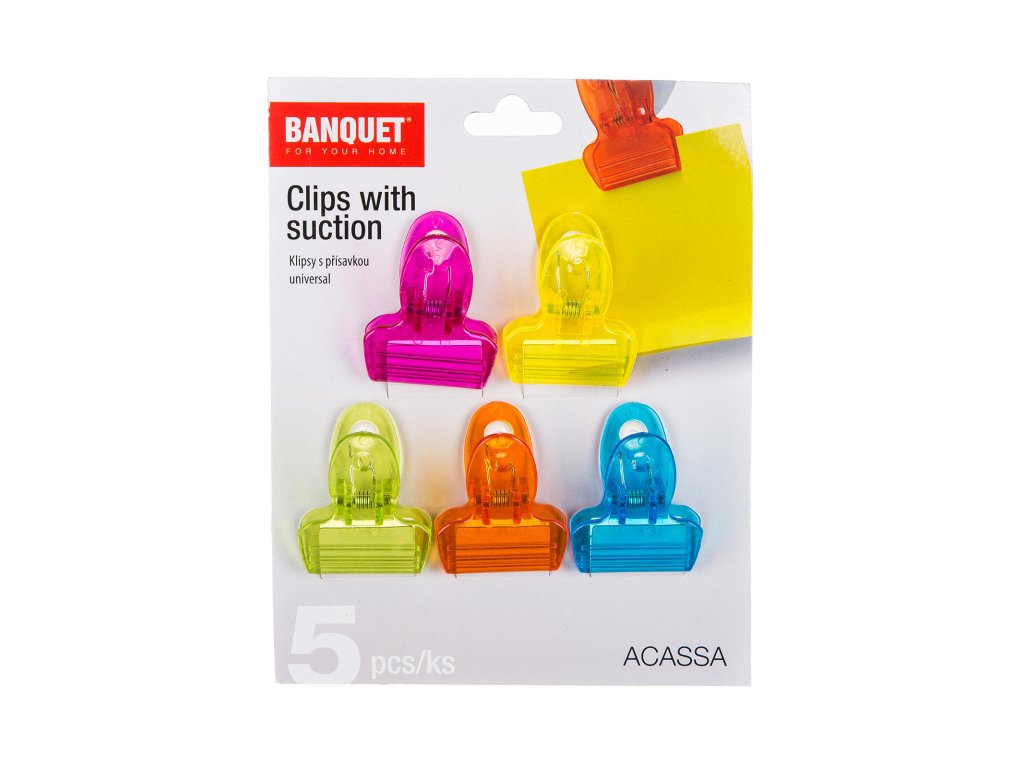 Klip s přísavkou, na papír, mix barev (5 ks) ACASSA. balení: 5 ks mix barev: žlutá, oranžová, růžová, modrá, zelená Sada plastových klipsů na papír, s přísavkou. Klipsy jsou vyrobeny z plastu v mixu barev a jsou určeny k přichycení papíru s poznámkami, vzkazy apod.Obrázky jsou pouze ilustrativní.