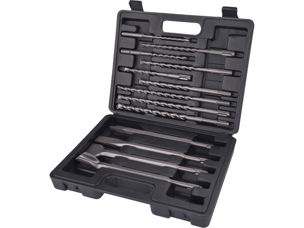 | doplňující parametr: | 250mm: plochý 20 a 40mm, špičatý, drážkovací, vrtáky: O 6-8-10x160mm, O 8-10-12x210mm, O 10-12-14x260mm, v plastovém kufru |