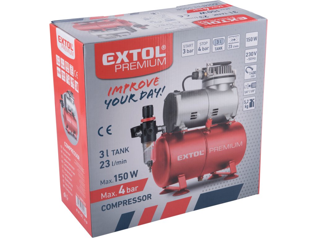 Tichý pístový kompresor je určen především pro stříkací pistole (airbrush) a další vzduchové nářadí jako například sponkovačky, ofukovací pistole, atd. Je vhodný i pro huštění pneumatik bicyklů i automobilů. Kompresor má 3l vzduchovou nádrž, která zajišťuje plynulý proud vzduchu pro práci. Je vybaven odlučovačem kondenzátu a nečistot ze vzduchu a tlakoměrem.Obrázky jsou pouze ilustrativní.