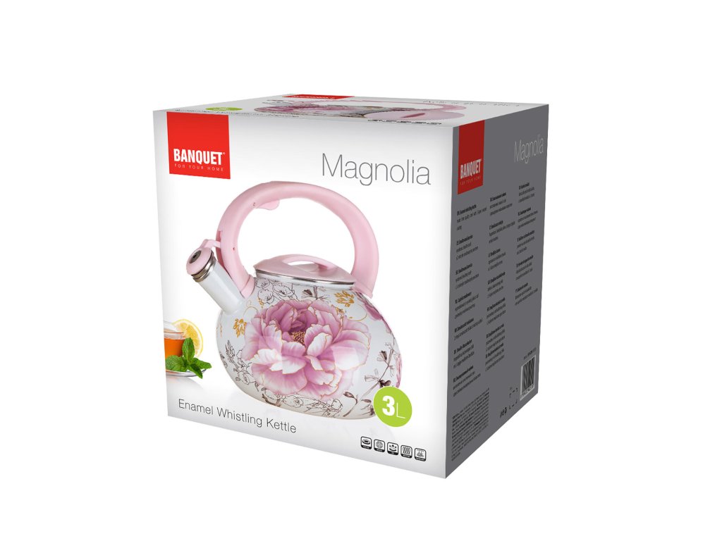 Konvice pr. 22,5 cm 3 l MAGNOLIA. objem: 3 litru Pro krásný začátek dne. Smaltovaná konvice s romantickým dekorem magnolie vám zpříjemní každou ranní kávu či čaj. Navíc bude krásným dekoračním prvkem vaší kuchyně. Konvice je vhodná na všechny typy ohřevu, včetně indukce. Součástí je píšťalka, která oznamuje, že voda dosáhla bodu varu.Obrázky jsou pouze ilustrativní.