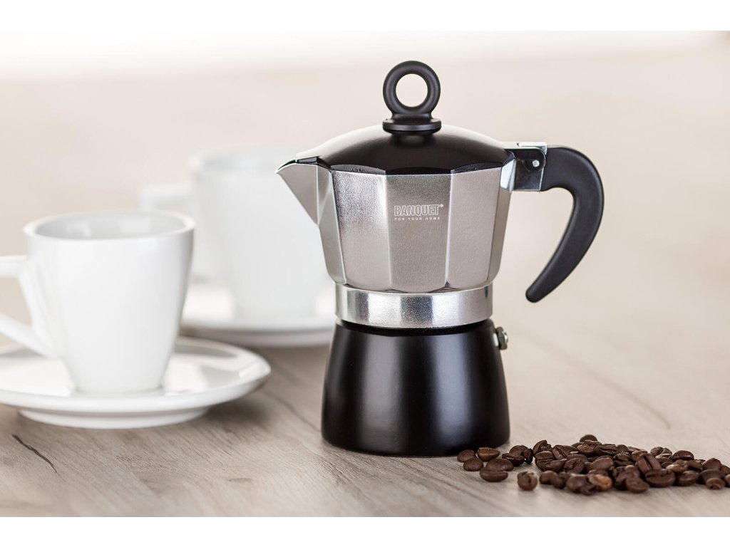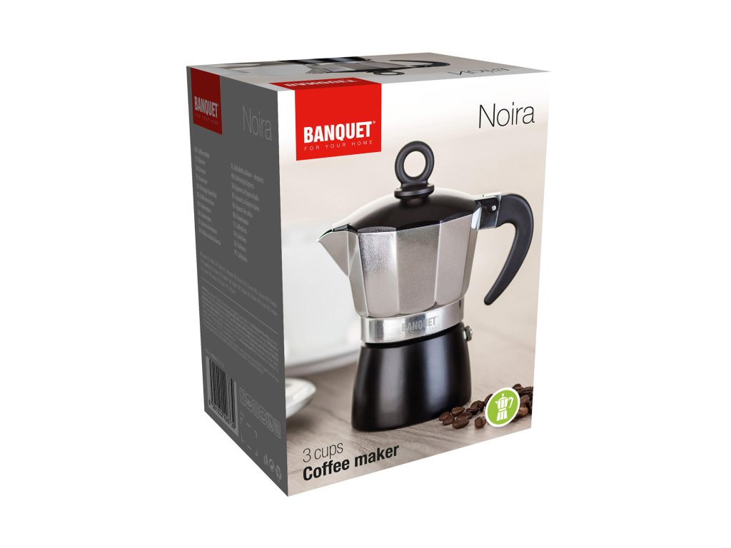 Kávovar NOIRA, 3 šálky, Al, ČER. objem: 150 ml barva: černá Kávovar NOIRA je tradiční kávovar pro domácí přípravu chutné silné kávy. Je vhodný pro použití na plynových, elektrických a sklokeramických deskách. Hliníkové tělo kávovaru již po několika šálcích získá patinu, která je pro správnou chuť kávy nepostradatelná. Kávovar je opatřen bezpečnostním ventilem. Kávovar není vhodný pro mytí v myčce.Obrázky jsou pouze ilustrativní.