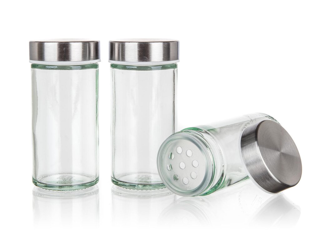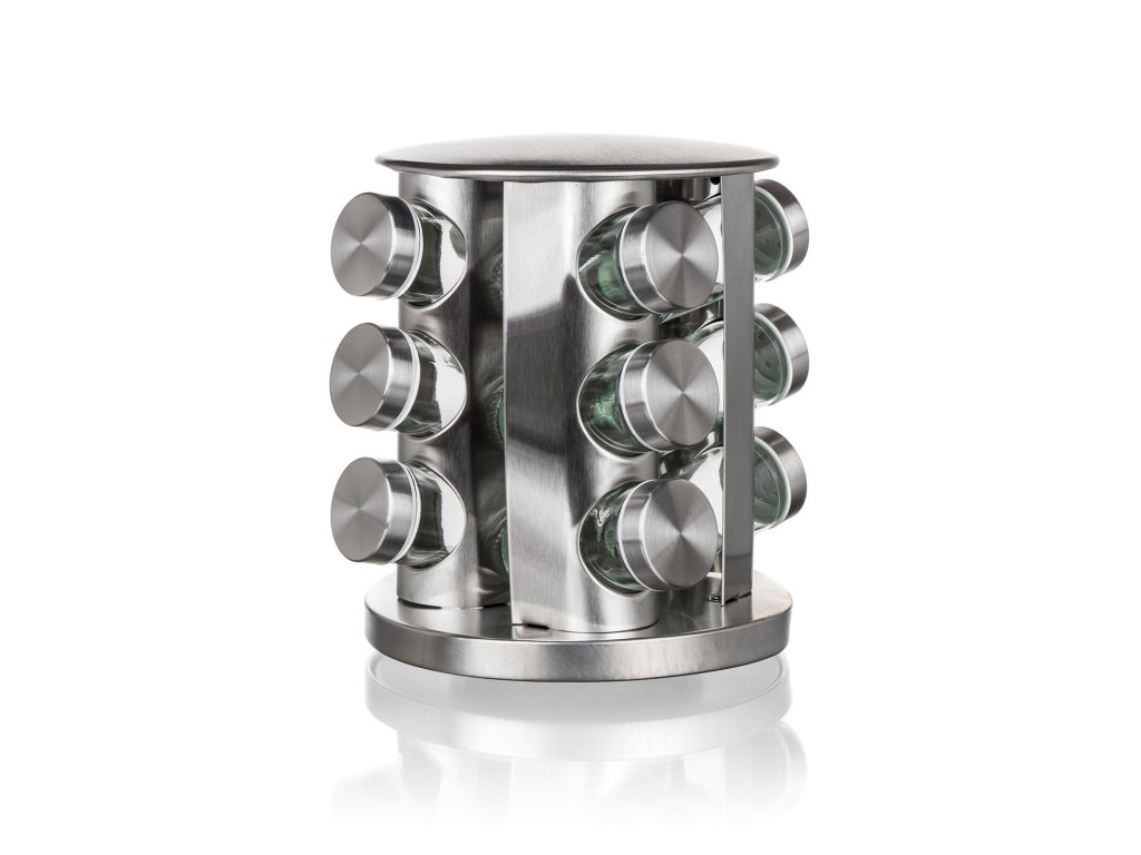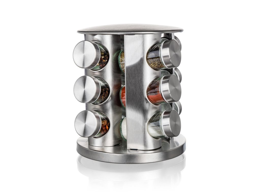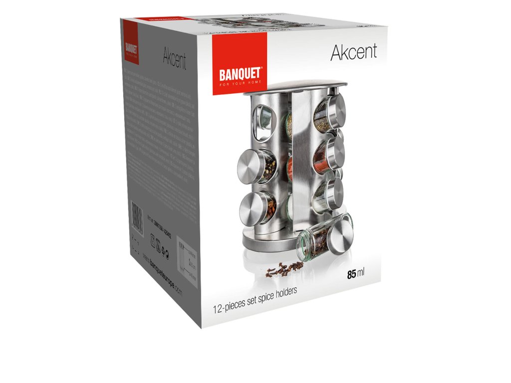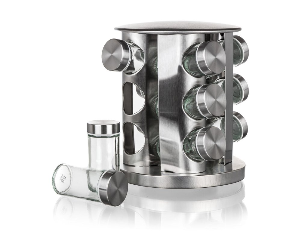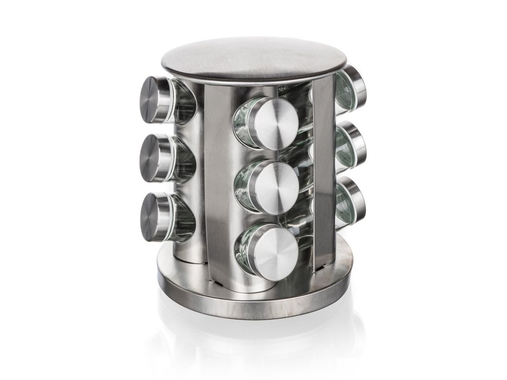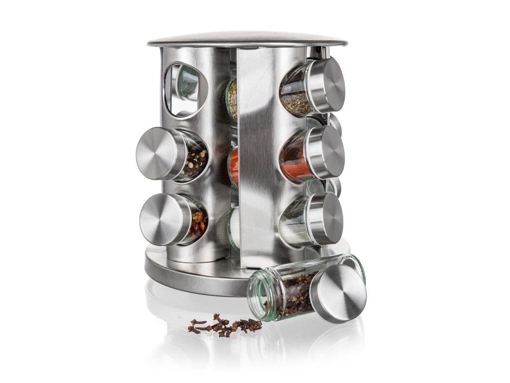 Kořenka AKCENT skl. + kov. (12 ks), s otočným stojánkem nerez. rozměry jedné kořenky s víčkem: 4,4 x 9,5 cm objem jedné kořenky: 85 ml rozměry stojanu: materiál: sklo, kov, plast sada kořenek Akcent obsahuje: 12 x skleněná kořenka s plastovým víčkem 1 x otočný nerezový stojánek 21 x 23 cm Sada kořenek AKCENT obsahuje 12 skleněných kořenek s plastovým víčkem. Praktický otočný stojan je vyroben z nerezové oceli a plastu. Vhodné do myčky na nádobí (bez víčka).Obrázky jsou pouze ilustrativní.
