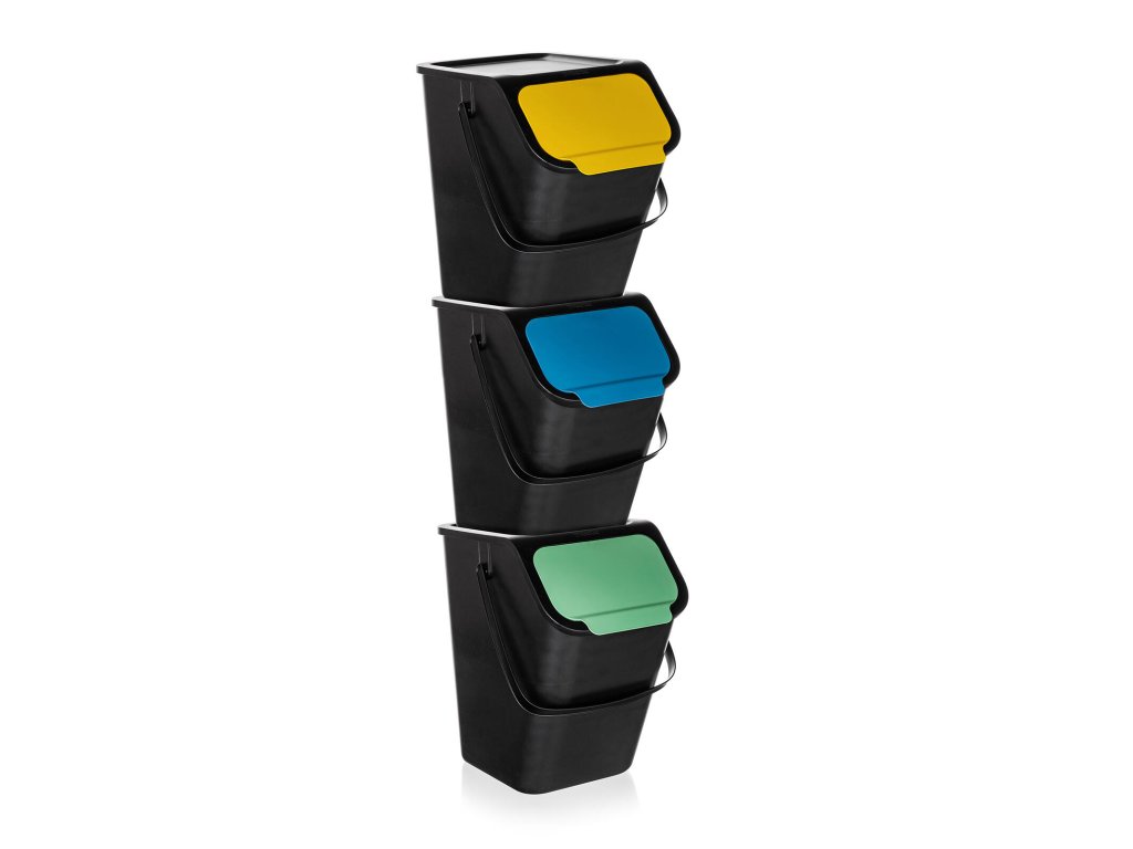 3dílná sada odpadkových košů na tříděný odpad BINI, určená na třídění skla, plastu a papíru. Koše jsou vhodným pomocníkem v domácnosti, navíc jsou stohovatelné a tím ušetříte prostor. Objem koše je 25 l. Rozměry 1 koše: 35,5 x 24,5 x 37 cm. Možno použít s i bez pytle na odpadky. Vhodný na odpadkový pytel o objemu 60 l.Obrázky jsou pouze ilustrativní.