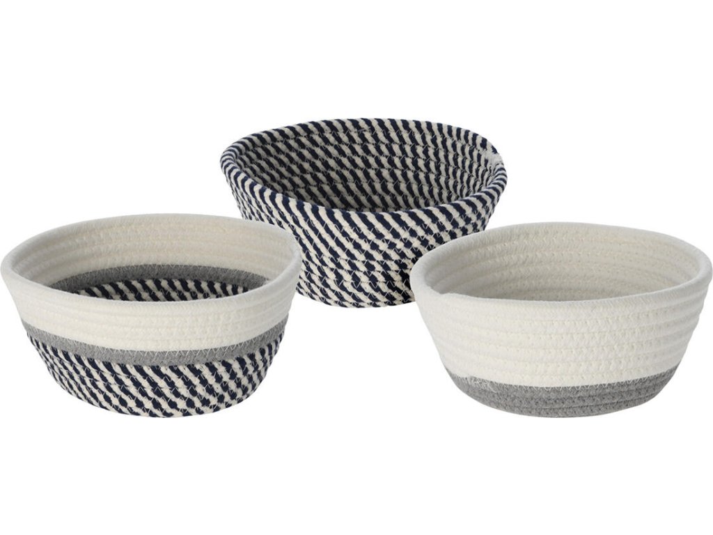 Košík kulatý kónický pr. 18 cm, BA mix barev, mix dekorů. horní průměr: 18 cm spodní průměr: 13,5 cm výška: 8,5 cm materiál: bavlna mix barev: modrá / bílá, modrá / bílá / šedá, bílá / šedá Praktický košíček pro rozmanité použití.Obrázky jsou pouze ilustrativní.