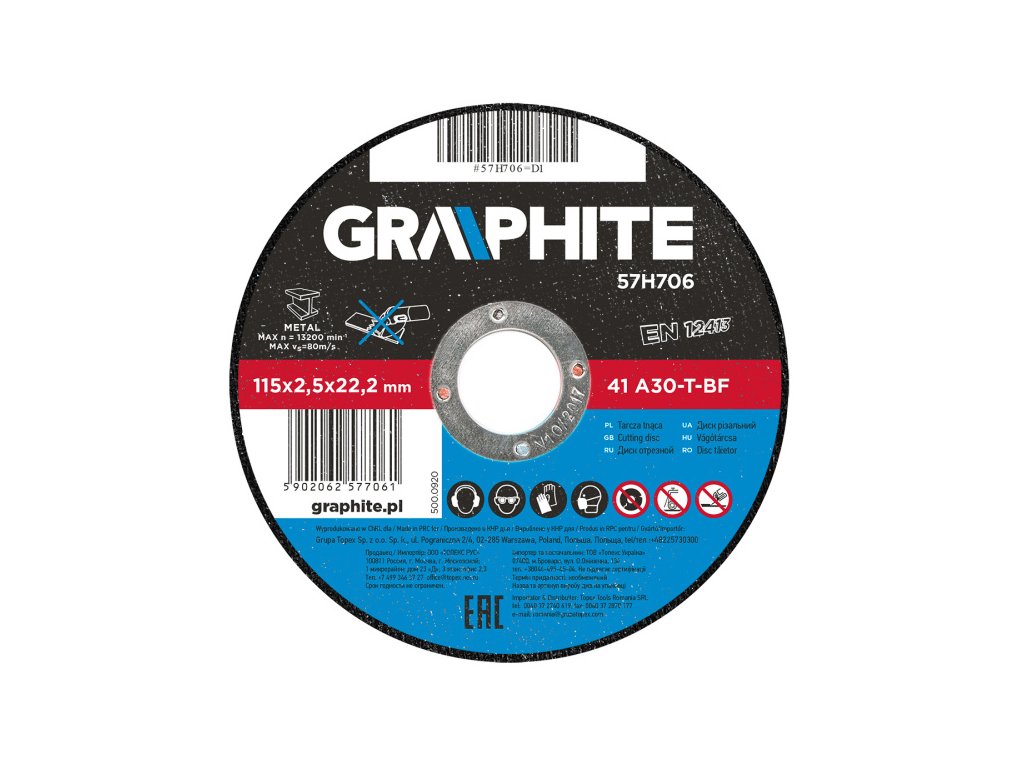 Kovový řezný kotouč 115 x 2,5 x 22,2 mm, 41 A30-T-BF Kotouč na řezání kovů GRAPHITE díky pokročilé konstrukci a zredukované tloušťce umožňuje výrazně zkrátit čas řezání. Zajišťuje vysokou úroveň bezpečnosti při práci, zejména díky souladu výrobku s normou EN12413.Obrázky jsou pouze ilustrativní.