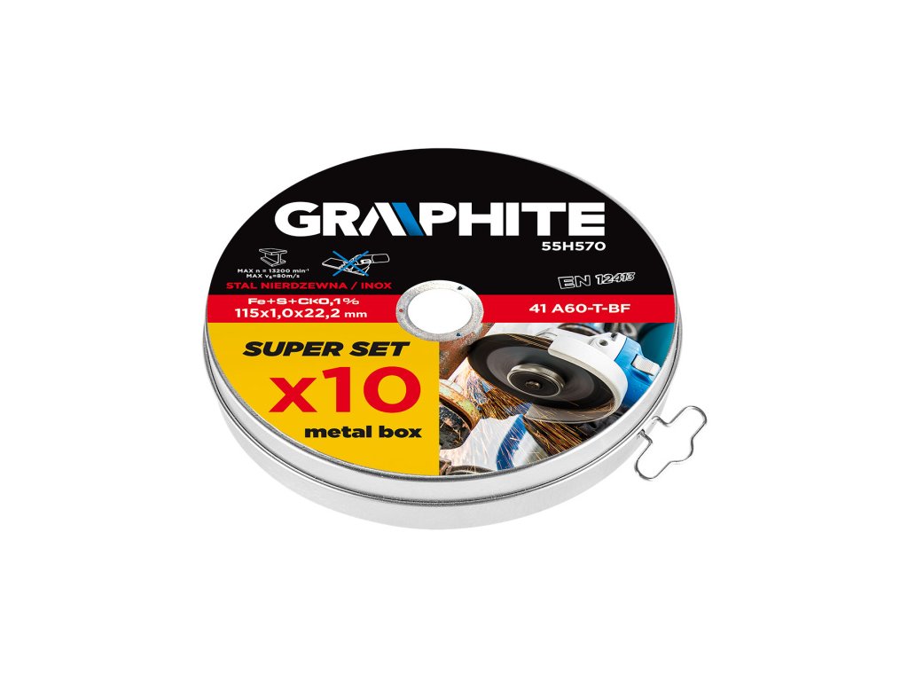Kovový řezný kotouč 115 x 1 x 22,2 mm, 41 A60-T-BF, INOX, 10 ks Kotouče na řezání kovu GRAPHITE (ref. č. 55H570) s vnějším průměrem 115 mm umožňují díky pokročilé konstrukci a omezení tloušťky významně zkrátit dobu řezání. Jsou určeny hlavně k řezání nerezové oceli díky omezenému obsahu síry, chloru a železa. Zaručuje vysokou úroveň bezpečnosti práce díky shodě produktu s normou EN12413.Obrázky jsou pouze ilustrativní.