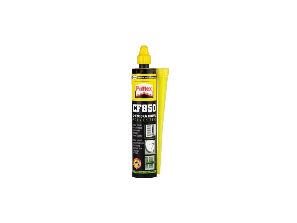 Ukotvování pomocí bezstyrenové polyesterové pryskyřice funguje u plných i dutých materiálů a všude tam, kde není možné použít roztažitelné středicí čepy. Polyesterová technologie Polyester je klasická reaktivní pryskyřice používaná na výrobu dvousložkové malty, při které se používají nenasycené polyesterové pryskyřice rozpuštěné ve styrenu a bezstyrenové nenasycené polyesterové pryskyřice s monomery na bázi styrenu jako reaktivním rozpouštědlem. Pattex CF850 malta je bezstyrenová a vyvinutá pro strukturní chemické vazby pro upevnění mechanických elementů k minerální konstrukci. - Neobsahuje styren - Snadné, univerzální a rychlé použití - Německá a francouzská certifikaceObrázky jsou pouze ilustrativní.