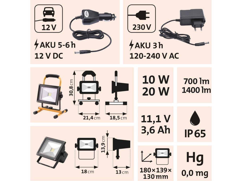 Přenosný LED nabíjecí reflektor je zdrojem příjemného bílého světla, které kvalitou odpovídá dennímu světlu. LED diody mají nízkou spotřebu energie při vysoké intenzitě světla. Reflektor lze používat jako přenosný zdroj světla se stojánkem bez napájecího kabelu a bez nutnosti připojení ke zdroji el. proudu, protože zdrojem el. energie je předem nabitý akumulátor. Je vybavena přepínačem mezi 10 a 20W a speciálním elektrickým obvodem „Constant current“, který dodává v nastavení 10W konstantní proud po dobu cca 6h a v nastavení 20W po dobu cca 4h a tím zajišťuje po tuto dobu max. světelný výkon svítilny bez klesání intenzity světla a poté se svítilna vypne. Díky možnosti nabíjení z 12V zásuvky automobilu, malým rozměrům, mechanické odolnosti, odolnosti proti dešti, lze svítilnu mít jako součást výbavy automobilu a jako zdroj světla při práci, kempování, rybaření, na zahradě apod.Obrázky jsou pouze ilustrativní.