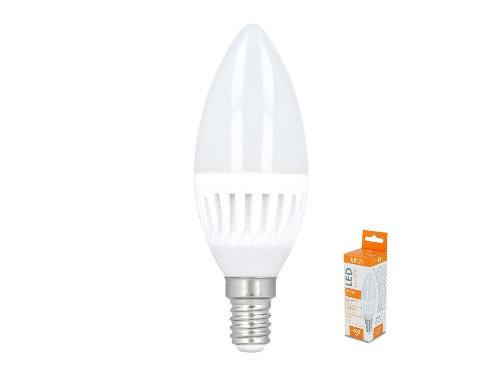 (BAL:1/10ks)LED žárovka s paticí E14 a výkonem 10W, úhel vyzařování: 180°, teplota barvy: 3000K, svítivost: 900lm, ekvivalent žárovky 66Wrozměr:37x110mm15000 zap/vypživotnost: 30000hod.Obrázky jsou pouze ilustrativní.