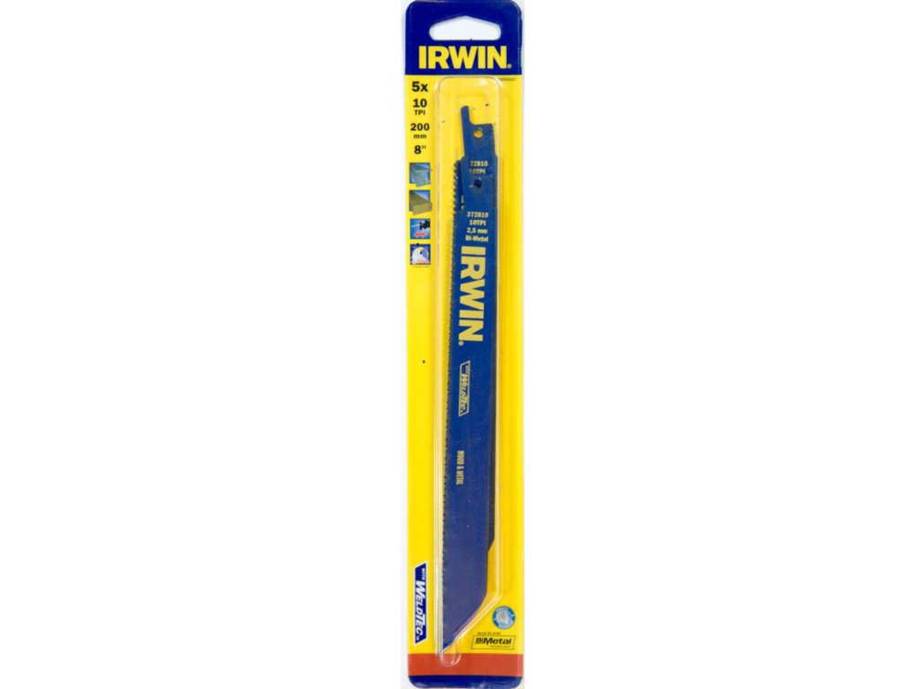 List pilový na kov a dřevo do mečových pil, 200 mm / 10TPI ( 5 ks ) IRWIN Délka: 200 mm Počet zubů / TPI: 10 Balení: 5 ks Bimetalová konstrukce pro rychlejší řezání, delší životnost ostří, které se může ohnut, aniž by se zlomilo. Technologie WeldTec - zuby jsou pevnější a více vydží. Díky 8 % kobaltu zůstanou zuby déle ostré. Zdokonalená konfigurace zubů.Obrázky jsou pouze ilustrativní.