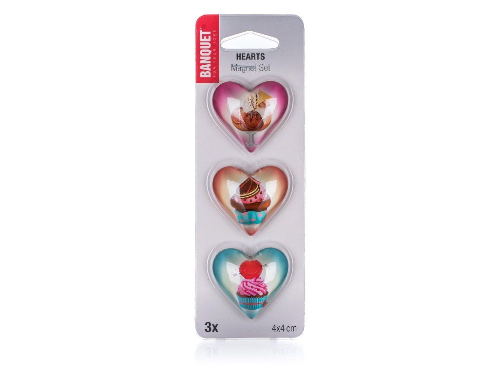 Magnetky HEARTS mix dekorů (3 ks). balení: 3 ks Sada 3 ks ozdobných magnetek na lednici s dekorem HEARTS. Magnetky slouží nejen jako dekorace v kuchyni, ale mohou najít i praktické využití např. na připevnění receptů na lednici.Obrázky jsou pouze ilustrativní.